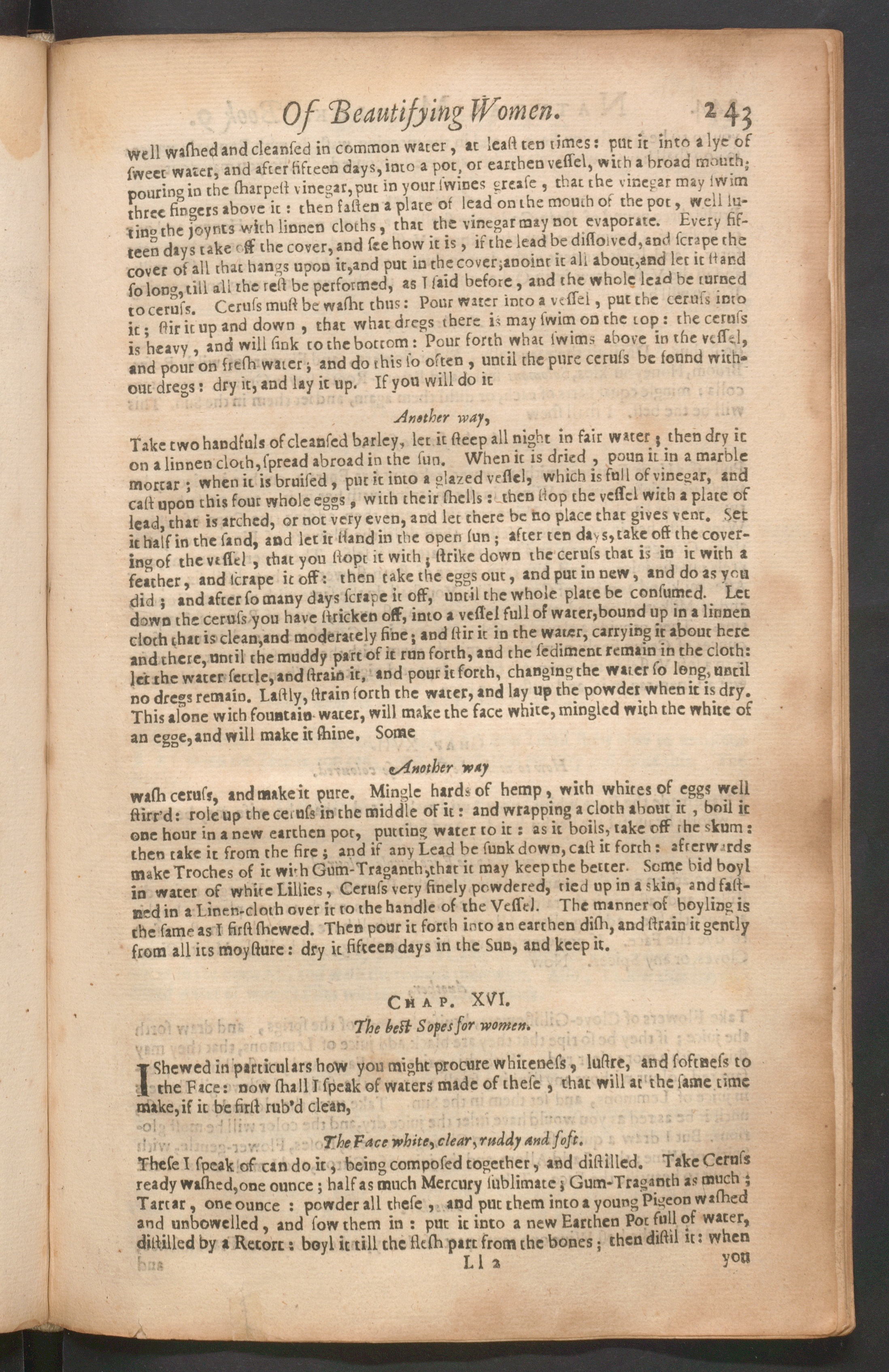 Take two handful* of cleansed barley, let it steep all night in fair water; then dry iton a linnen cloth,spread abroad in the sun. When it is dried , poun it in a marblemortar; when it is bruised, put it into a glazed vcflel, which is full of vinegar, andcast upon this four whole eggs, with their shells; then stop the vessel with a plate oflead, that is arched, or not very even, and let there be ho place that gives venc. Setit half in the sand, and let it stand in the open fun,- after ten days, take off the cover-ing of the vessel , that you stopt it with i strike down the ceruse that is in it with afeather, and tcrape it off: then take the eggs out, and put in new, and do as youdid 5 and after so many days scrape it off, unt il the whole plate be consumed. Letdown the ceruse you have stricken off, into a vessel full of water,bound up in a linnendoth that is clean,and moderately fine • and stir it in the water, carrying it about hereand there, until the muddy part of it run forth, and the sediment remain in the cloth:letthe water fettle, and strain it, and pour it forth, changing the water so long, untilno dregs remain. Lastly, strain forth the water, and lay up the powder when it is dry.This alone with fountain water, will make the face white, mingled with the white ofan egge,and will make it shine, Some