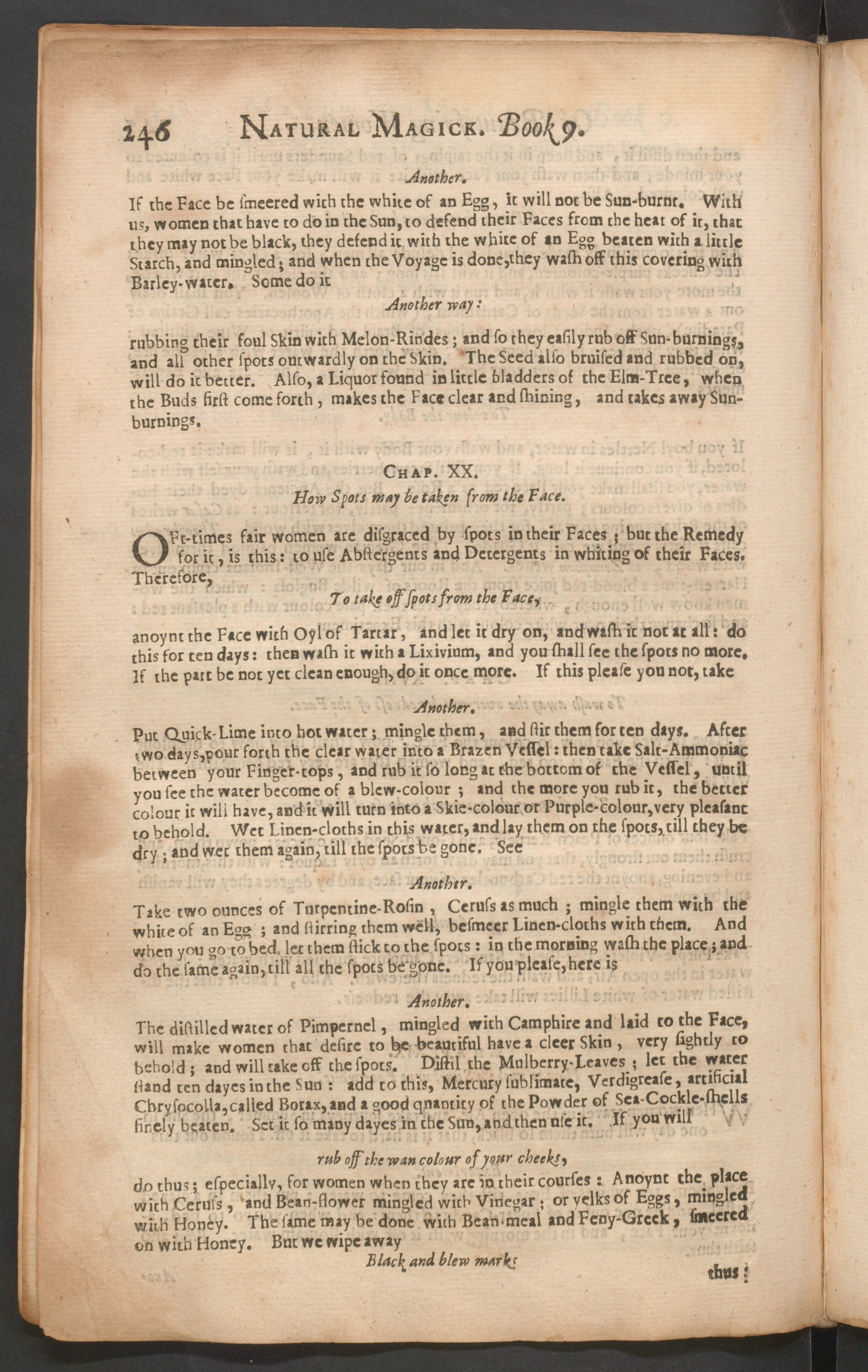 If the Face be smeered with the white of an Egg, it will not be Sun-burnr. Withus, women that have to do in the Sun, to defend their Faces from the heat of it, thatthey may not be black, they defend it with the white of an Egg beaten with a littleStarch, and mingled - and when the Voyage is done,they wash off this covering withBarley-water, Some do it