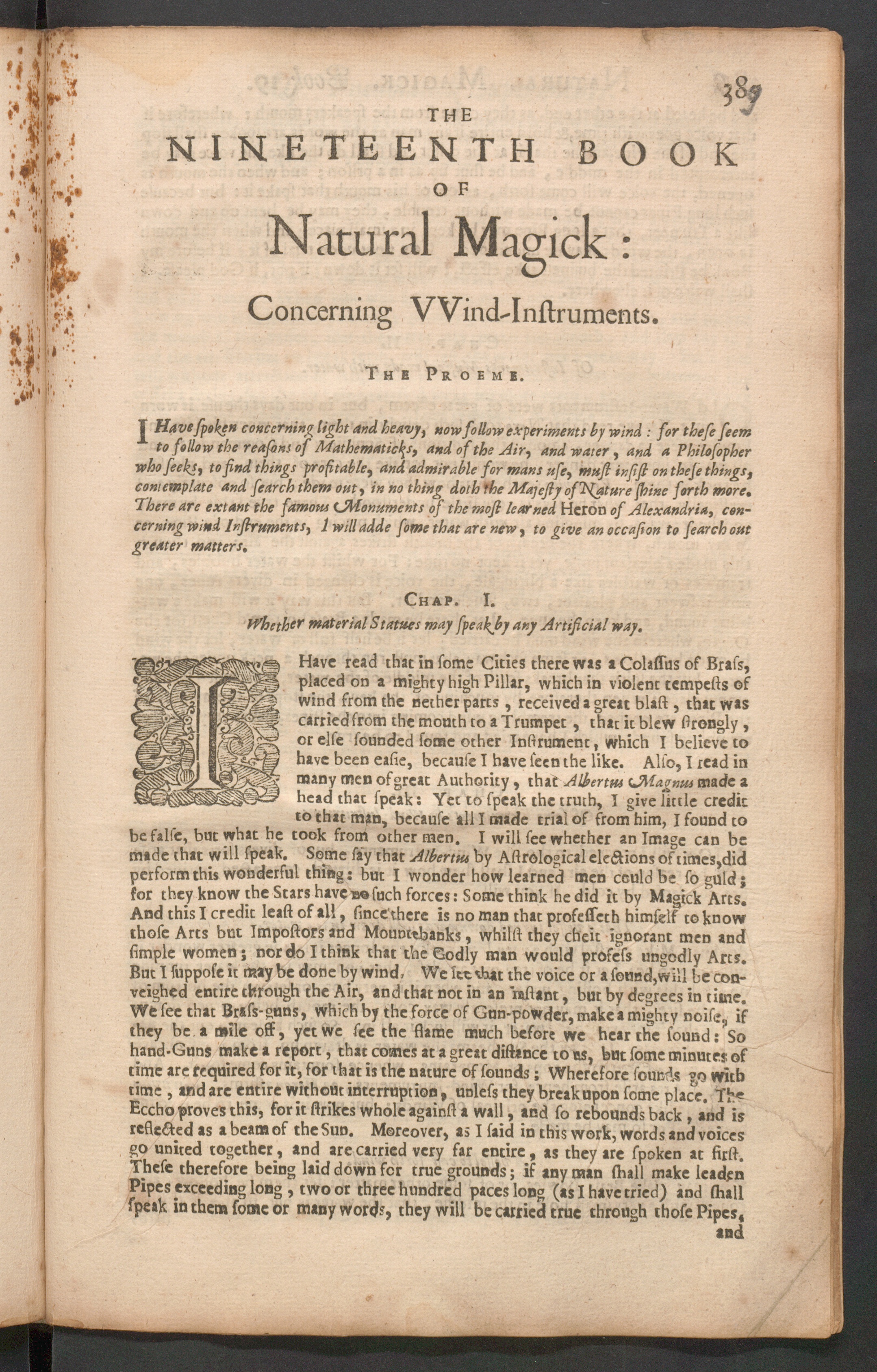 B Have read that in some Cities there was a Coliffus of Brass,placed on a mighty high Pillar, which in violent tempests ofwind from the nether parts , received a great blast , that wascarried from the month to a Trumpet, that it blew strongly,or else sounded some other Instrument, which I believe tohave been easie, because I have seen the like. Also, I read inmany men of great Authority, that Albertus CMagnus made ahead that speak: Yet to speak the truth, I give little creditto that man, because all I made trial of from him, I found tobe false, but what he took from other men. I will see whether an Image can bemade that will speak. Some say that Alberttu by Astrological elections of times,didperform this wonderful thing; but I wonder how learned men could be soguld;for they know the Stars have»• such forces: Some think he did it by Magick Arts.And this I credit least of all, since'there is no man that professcth himself to knowthose Arts but Impostors and Mounttbanks, whilst they chert ignorant men andsimple women; nor do I think that the Godly man would profess ungodly Arcs.But I suppose it may be done by wind- We Itt vhat the voice or a sound,will be con-veighed entire through the Air, and that not in an restart, but by degrees in time.We fee that Brass-guns, which by the force of Gun-powder, make a mighty noise, ifthey be a mile off, yet we see the flame much before we hear the sound: Sohand-Guns make a report, that comes at a great distance to es, but some minuter oftime are required for it, for that is the nature of sounds; Wherefore sounds go withtime , and are entire without interruption , unless they break upon some place.Eccho proves this, for it strikes whole against a wall, and so rebounds back , and isreflected as a beam of the Sun. Moreover, as I said in this work, words and voicesgo united together , and are carried very far entire, as they are spoken at first.These therefore being laid down scr true grounds; if any man (hall make leadenPipes exceeding long , two or three hundred paces long (as I have tried) and (hallspeak in them some or many word?, they will be carried true through those Pipes,