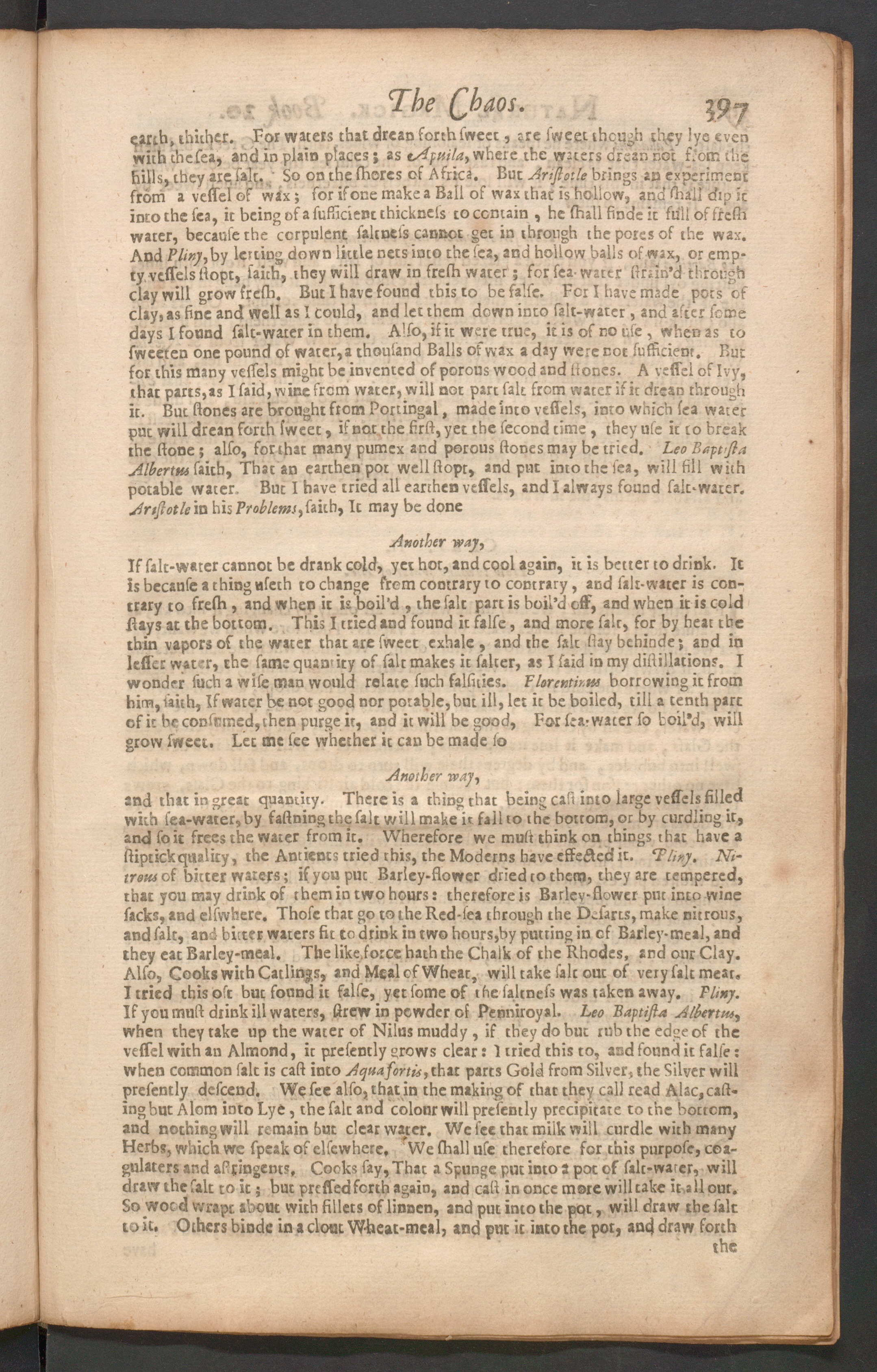 and that in great quantity. There is a thing that being cast into large vessels filledwith sea-water,by fastning the salt will make it fail to the bottom, or by curdling it,and so it frees the water from it. Wherefore we must think on things that have astiptick quality, the Antiencs tried this, the Moderns have effected it. liny . Ni-trons of bitter waters; if you put Bariey-flowcr dried to them, they are tempered,that you may drink of them in two hours: therefore is Bariev-flower put into winesacks, and clswhere. Those that go to the Red-sea through the Ddarts, make nitrous,and salt, and bitter waters fit to drink in two hours,by putting in of Birley-meal, andthey eat Barley-meal. The like.force hath the Chalk of the Rhodes, and our Clay.Also, Cooks with Catlings, and Meal cf Wheat, will take fait out of very salt meat.