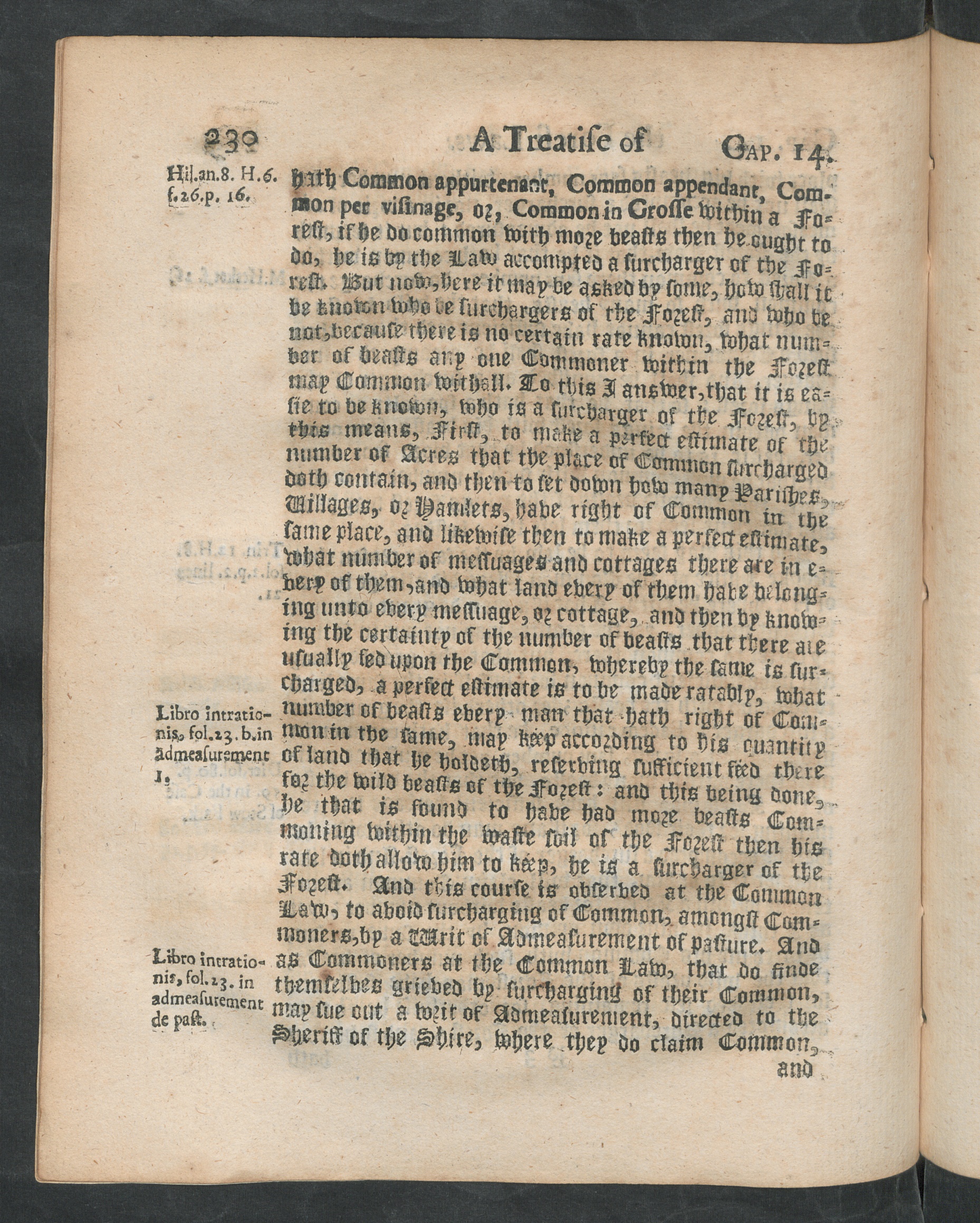 HM Common appurtenant, Common appendanr, Com-inonper vilinage, o?, ConunoninCroffetnitinna Fo-rest, ikhe do common with mo?e desks then heoughr todo, he isvx the tlato sccvmptkd s kurcharger ok the Fo-rest. But nov>,here it max be asked bx kowe, how (iall itbe Known who be kurchargers ok the Forest, and who denor,because there is no certain rate Known, what num-ber okdessts anx one Commoner within the Forestmax Common withs!!. Lo this I gnrwer,thst it is er-ste to be Known, who is a kurcharger ok the Fo?est, bx/:this means. First, to make a p^rffect estimate of thenumber ok Acres that the place ok Common Unchargeddoth contain, and then to ket down how man? VarlihesMilages, or Gamlets, hade right ok Common in thetame place, and likewise then to make a perfect estimate,what number ok messuages and cottages there are in e-derx ok them,and what land ederx ok them hade w long-ing unto ederx messuage, o? cottage, and then bx Know-ing the certaintx ok the number ok beasts that there areukuallx fed upon the Common, wherebx the same is sur-charged, a perfect estimate is to be maderatablx, whatnumber ok beasts ederx man that hath right ok Com-> nwnin the fame, max Keep according to his ouantirxok land that he howeth, rekerding sufficient feed thereko? the wild beasts ok the Fo?est: and this being done, .de that is found to hade had mo?e beasts Com-moning within the Waste roil ok the Forest then hisrate doth allow him to KLp, he is a Kircdarger of theFo?est. And this course is obkerdeo st the CommonLaw, to aboid surcharging of Common,, amongst Com-moners-bx a Mrit of Admeasurement of pasture. 2ndas Commoners at the Common Law, that do stnoethemselves grieded bp surcharging of their Common,max kue out a writ ok Admealurement, directed to theSheriff ok the Shire, where thex do claim Common,