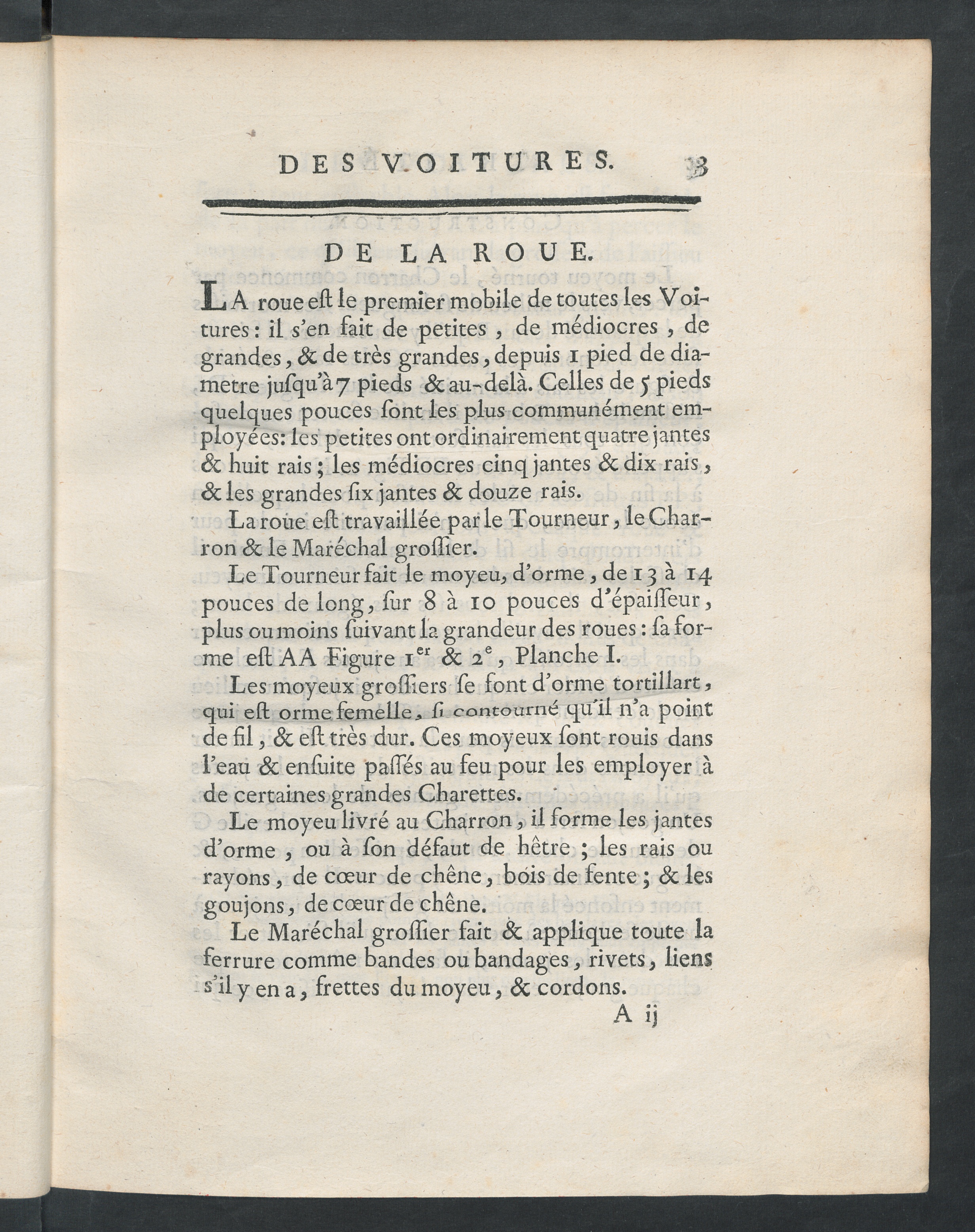 Le Tourneur fait le moyeu, d’orme, de 13 à 14pouces de long, íur 8 à 10 pouces d'épaisseur,plus ou moins suivant la grandeur des roues : fa for-me est AA Figure I er Sc 2 e , Planche I.