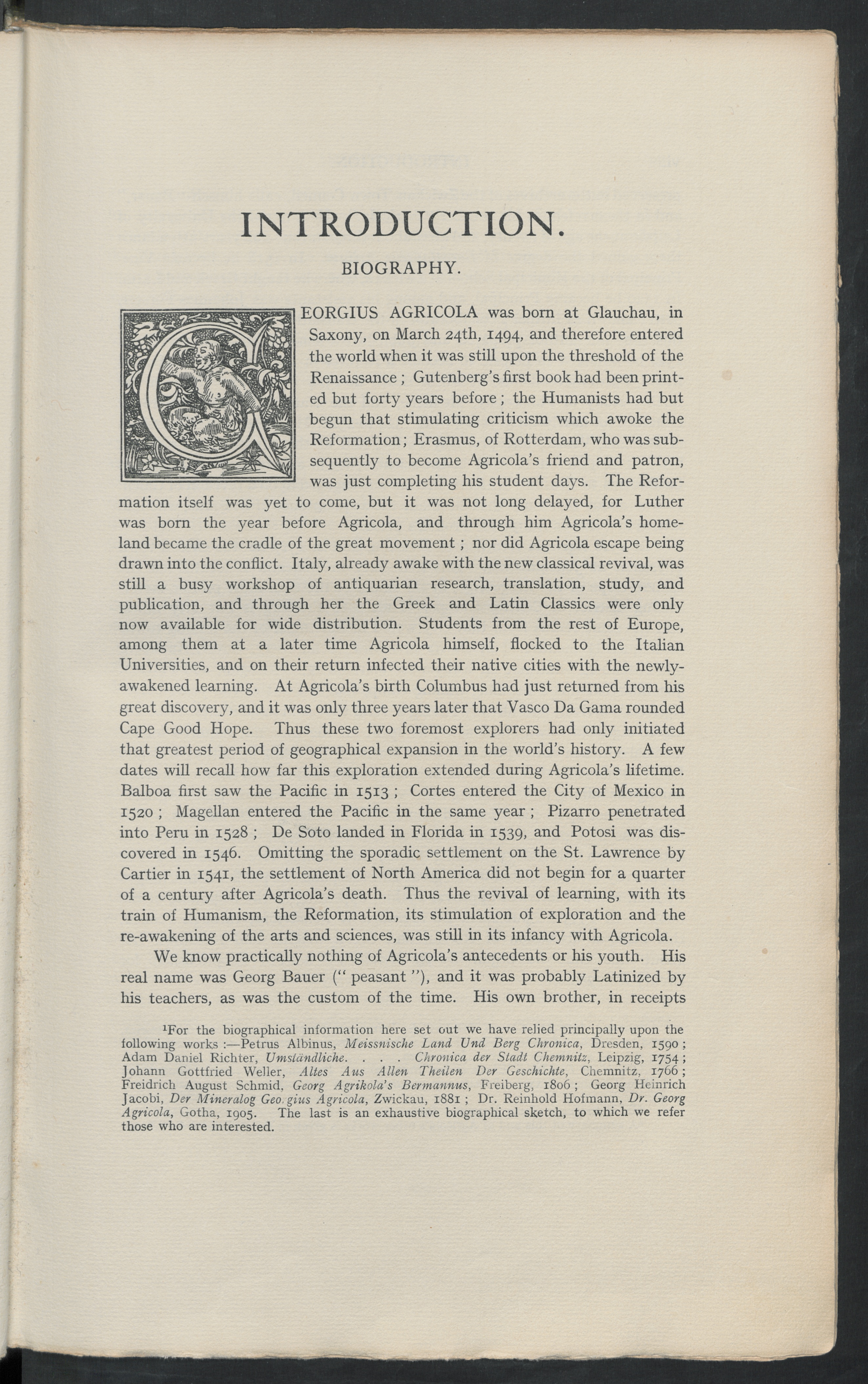 EORGIUS AGRICOLA was bom at Glauchau, inSaxony, on March 24th, 1494, and therefore enteredthe world when it was still upon the threshold of theRenaissance ; Gutenberg’s first book had been print-ed but forty years before; the Humanists had butbegun that stimulating criticism which awoke theReformation; Erasmus, of Rotterdam, who was sub-sequently to become Agricola’s friend and patron,was just completing his student days. The Refor-mation itself was yet to come, but it was not long delayed, for Lutherwas bom the year before Agricola, and through him Agricola’s home-land became the cradle of the great movement; nor did Agricola escape beingdrawn into the conflict. Italy, already awake with the new classical revival, wasstill a busy workshop of antiquarian research, translation, study, andpublication, and through her the Greek and Latin Classics were onlynow available for wide distribution. Students from the rest of Europe,among them at a later time Agricola himself, flocked to the ItalianUniversities, and on their return infected their native cities with the newly-awakened learning. At Agricola’s birth Columbus had just returned from hisgreat discovery, and it was only three years later that Vasco Da Gama roundedCape Good Hope. Thus these two foremost explorers had only initiatedthat greatest period of geographical expansion in the world’s history. A fewdates will recall how far this exploration extended during Agricola’s lifetime.Balboa first saw the Pacific in 1513 ; Cortes entered the City of Mexico in1520 ; Magellan entered the Pacific in the same year ; Pizarro penetratedinto Pern in 1528 ; De Soto landed in Florida in 1539, and Potosi was dis-covered in 1546. Omitting the sporadic settlement on the St. Lawrence byCartier in 1541, the settlement of North America did not begin for a quarterof a century after Agricola’s death. Thus the revival of learning, with itstrain of Humanism, the Reformation, its stimulation of exploration and there-awakening of the arts and sciences, was still in its infancy with Agricola.