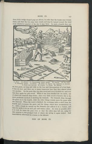 A — Box. B —Pivot. C—Transverse wood beams. D —Grate. E —Its feet.F—Burning wood. G—Stick. H—Pans in which the bismuth is melted.I —Pans for moulds. K —Cakes. L —Fork. M —Brush.