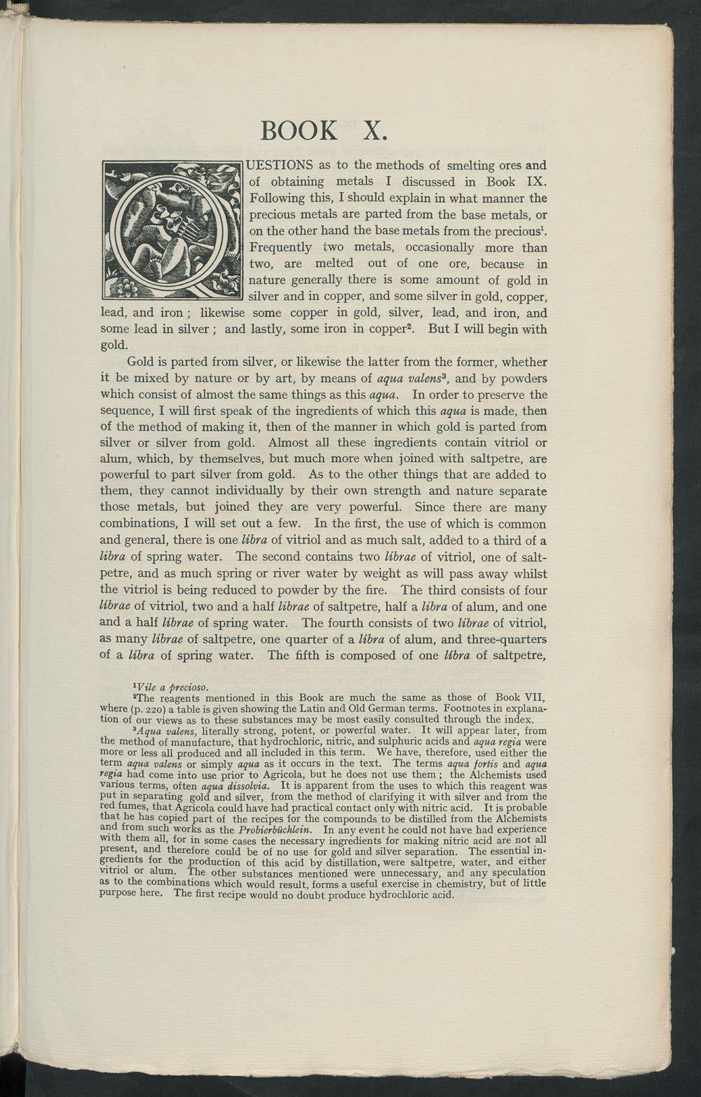 UESTIONS as to the methods of smelting ores andof obtaining metals I discussed in Book IX.Following this, I should explain in what manner theprecious metals are parted from the base metals, oron the other hand the base metals from the precious 1 .Frequently two metals, occasionally more thantwo, are melted out of one ore, because innature generally there is some amount of gold insilver and in copper, and some silver in gold, copper,lead, and iron ; likewise some copper in gold, silver, lead, and iron, andsome lead in silver ; and lastly, some iron in copper 2 . But I will begin withgold.