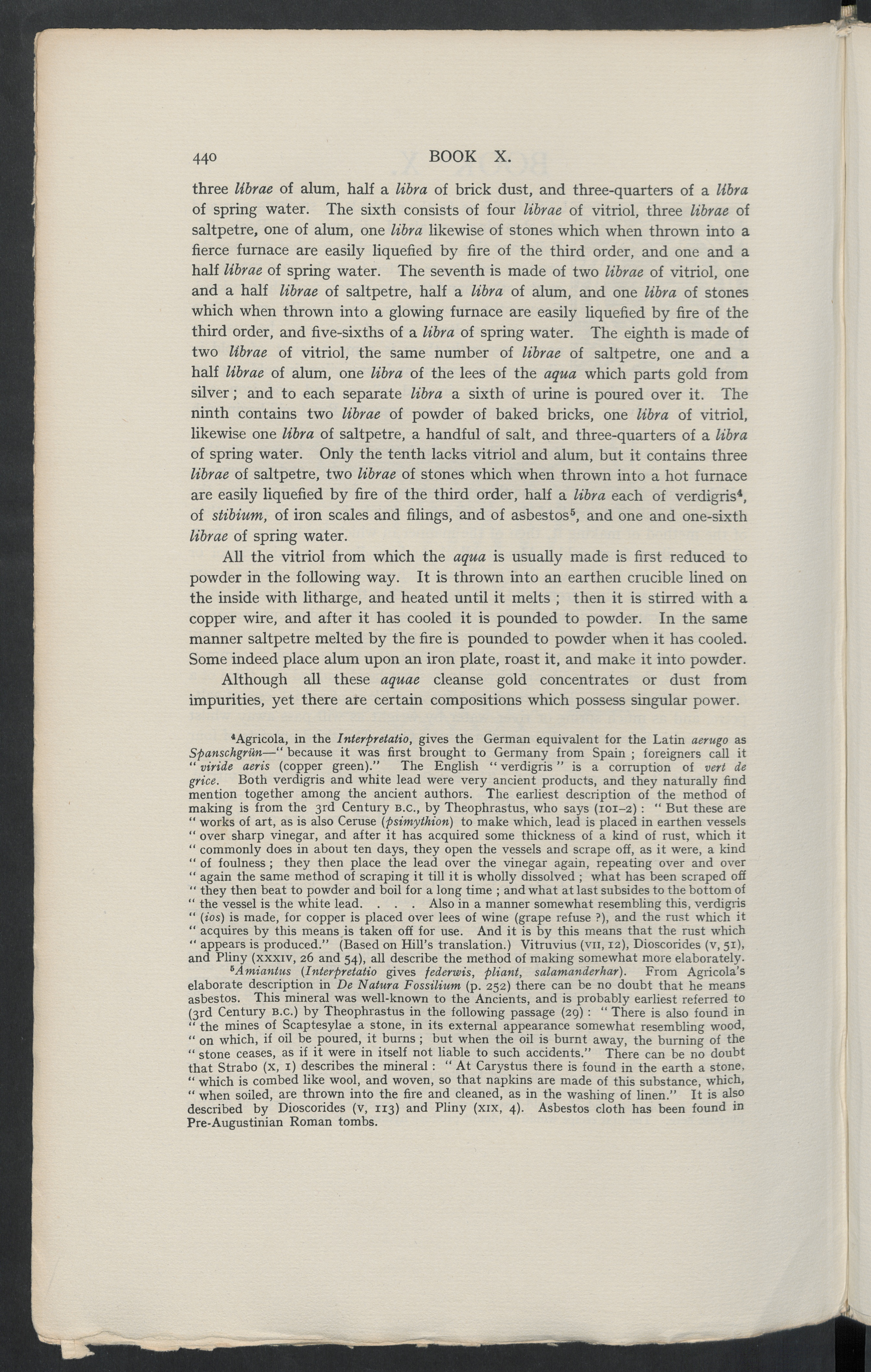 “ ( ios) is made, for copper is placed over lees of wine (grape refuse ?), and the rust which it“ acquires by this means is taken off for use. And it is by this means that the rust which” appears is produced.” (Based on Hill’s translation.) Vitruvius (vu, 12), Dioscorides (v, 51),and Pliny (xxxiv, 26 and 54), all describe the method of making somewhat more elaborately.