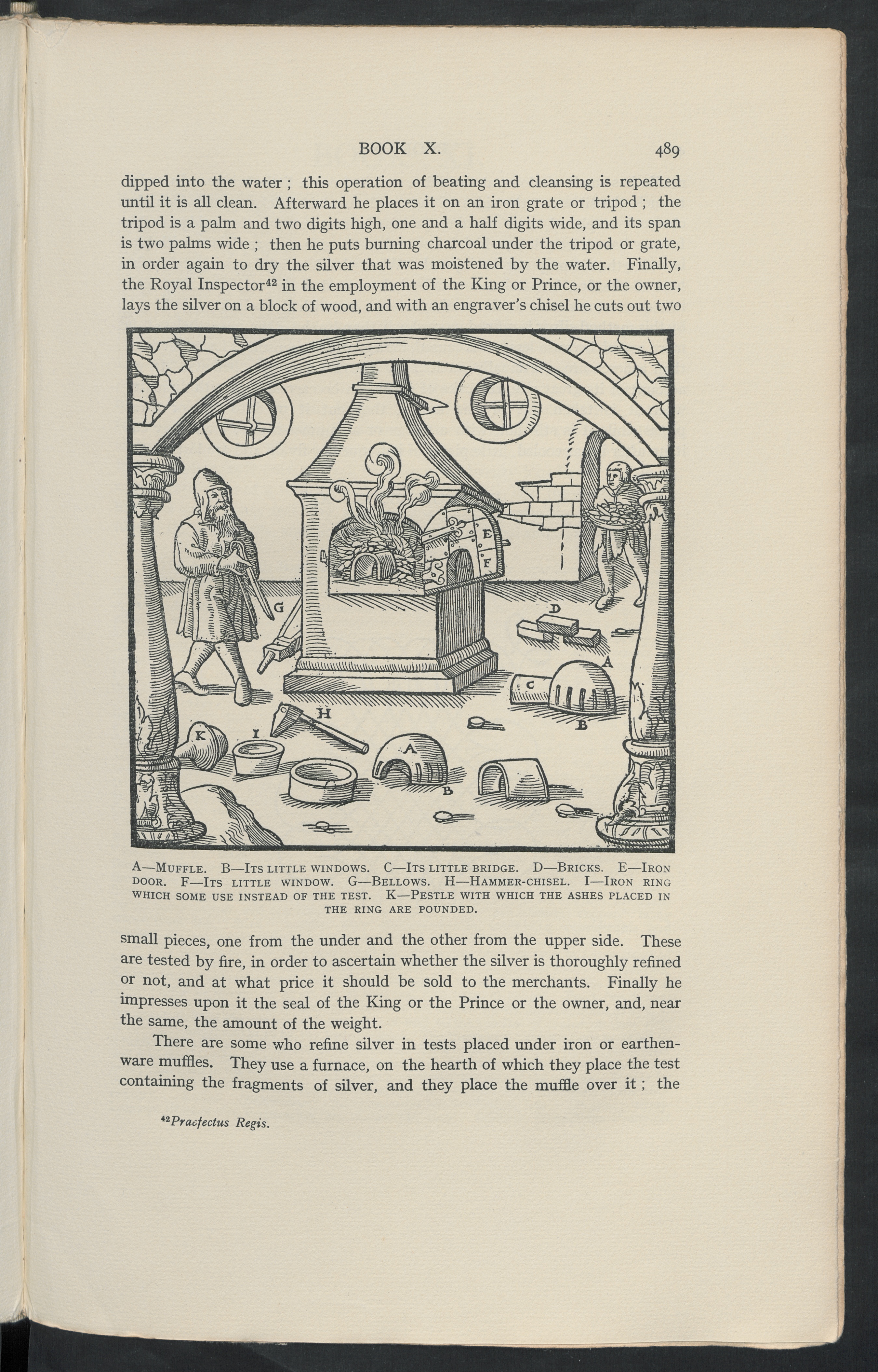 There are some who refine silver in tests placed under iron or earthen-ware muffles. They use a furnace, on the hearth of which they place the testcontaining the fragments of silver, and they place the muffle over it; the