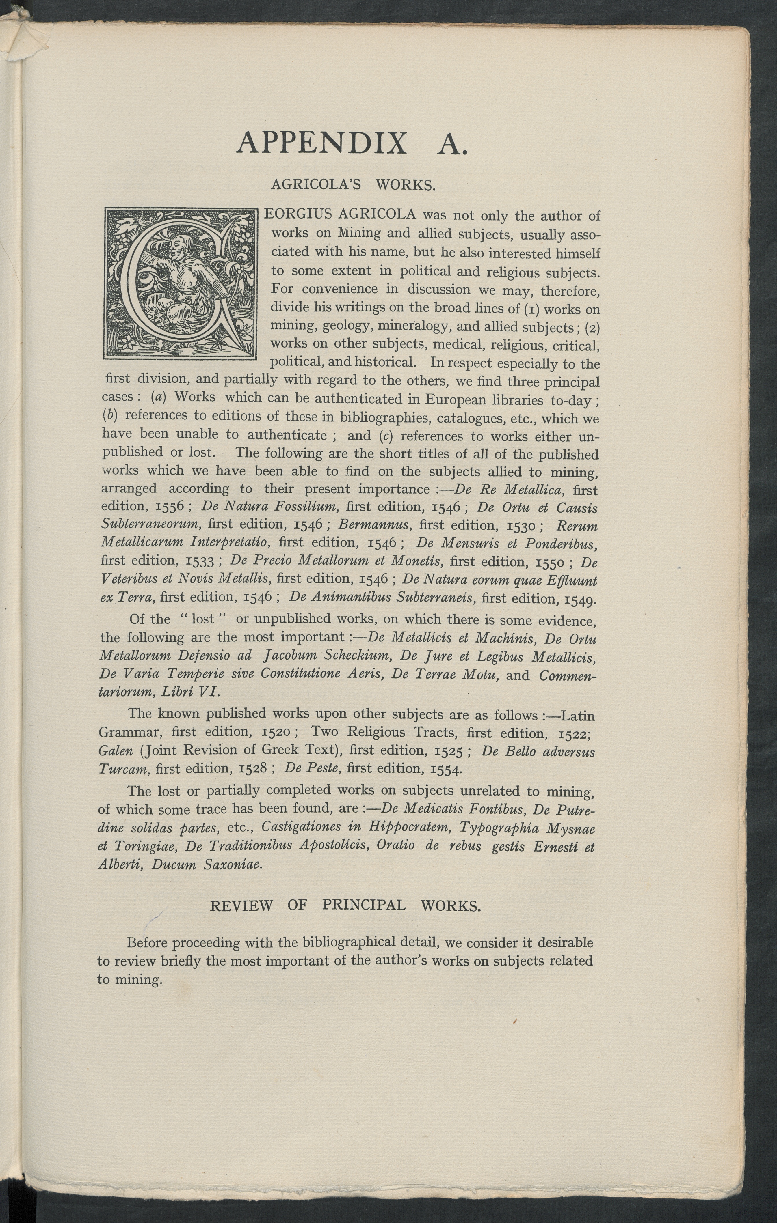 The lost or partially completed works on subjects unrelated to mining,of which some trace has been found, are :— De Medicatis Fontibus, De Putre-dine solidas partes, etc., Castigationes in Hippocratem, Typographia Mysnaeet Toringiae, De Traditionibus Apostolicis, Oratio de rebus gestis Ernesti etAlberti, Ducum Saxoniae.