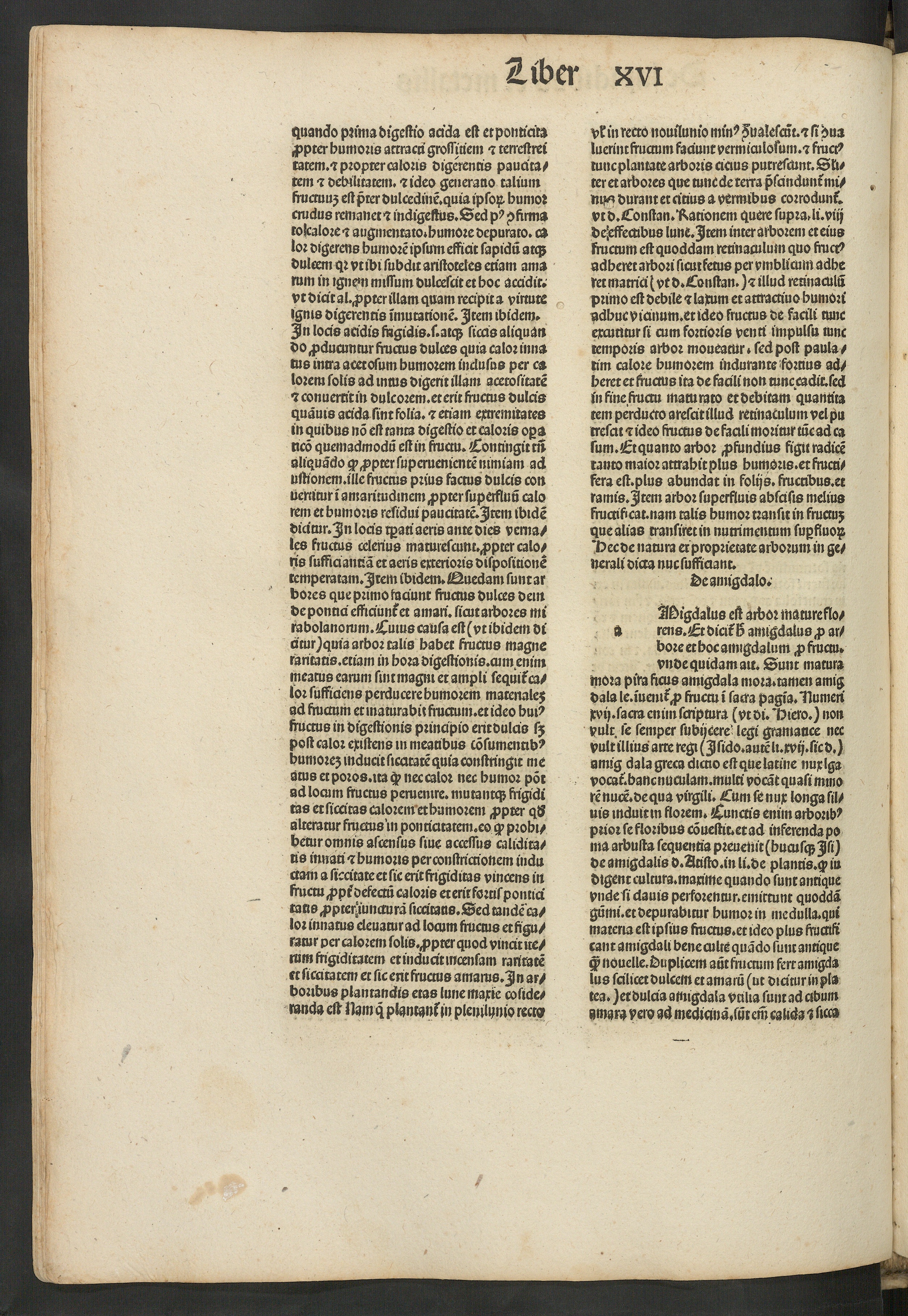XVIvͤl in recto nouilunio minus Zualescunt. 7 si dualuerint fructum faciunt vermiculosum. ⁊ fruci-tunc plantate arboris cicius putrescunt. Sli-ter et arbores que tunc de terra p̄scinduntr mi-nus durant et citius a vermibus corrodunter.vt d. Constan. Rationem quere supra, li. viiide effectibus lune. Item inter arborem et eiusfructum est quoddam retinaculum quo fructumadberet arbori sicut fetus per vmblicum adheret matrici(vt d. Lonstan.) ⁊ illud retinaculumprimo est debile ⁊ laxum et alltractiuo humoriadbuc vianum. et ideo fructus de facili tuncexcutitur si cum fortioris venti impulsu tunctemporis arbor moueatur. sed post paula-tim calore humorem indurante fortius ad-beret et fructus ita de facili non tunc cadit. sedin fine fructu maturato et debitam quantitatem perducto arescit illud retinaculum vel putresat ⁊ ideo fructus de facili moritur tunc ad casum. Et quanto arbor profundius figit radicentanto maior attrahit plus humoris. et fructi-fera est. plus abundat in folijs. fructibus. etramis. Item arbor superfluis abscisis meliusfructificat. nam talis humor transit in fructuzque alias transiret in nutrimentum superfiuoꝛDec de natura et proprietate arborum in ge-nerali dicta nuc sufficiant.De amigdalo.Digdalus est arbor matureflo-rens. Et dicitur b amigdalus pro ar-bore et hoc amigdalum pro fruciu.vnde quidam ait. Sunt maturamora pira ficus amigdala mora. tamen amigdala le. iuenitur p fructu i sacra pagia. Numenxvij. sacra enim scriptura(vt di. Hiero.) nonvult se semper subijcere legi gramance necvult illius arte regi(Isido. aute li. rvij. sic d.)amig dala greca dictio est que latine nuxlgavocatur. banc nuculam. multi vocant quasi minoren nucem. de qua virgili. Cum se nux longa sil-uis induit in florem."Lunctis enim arborib"prior se floribus conuestit. et ad inferenda poma arbusta sequentia preuenit(hucusque Zsi)de amigdalis d. Atisto. in li. de plantis. quod indigent cultura. maxime quando sunt antiquevnde si dauis perforentur. emittunt quoddamgunti. et depurabitur humor in medulla. quimateria est ipsius fructus. et ideo plus fructificant amigdali bene culte quando sunt antiquequam nouelle. Duplicem autem fructum fert amigdalus scilicet dulcem et amarum(ut dicitur in platea.) et dulcia amigdala vtilia sunt ad cibum### amara vero ad medicinam, sunt enim calida ⁊ sicca