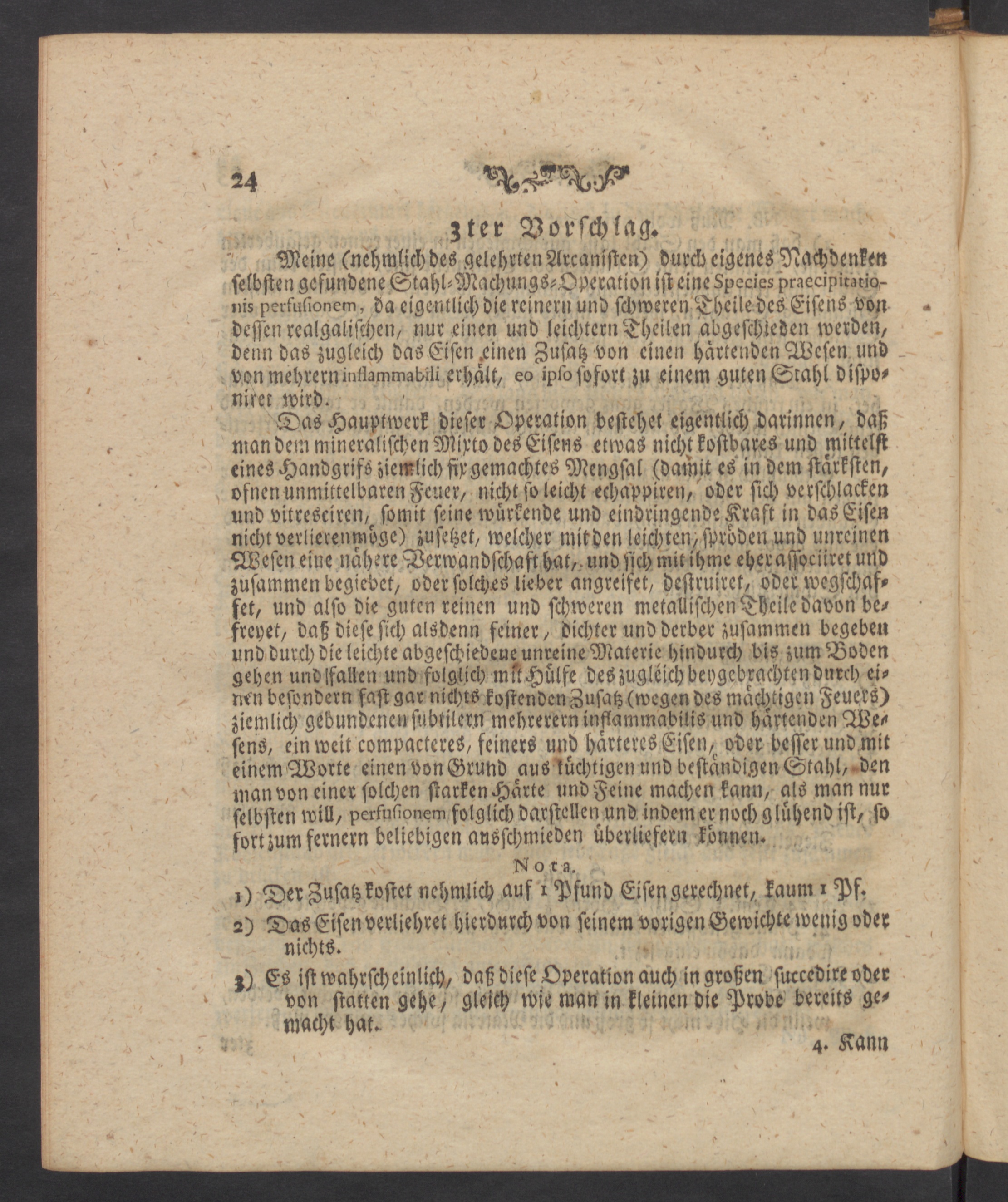 Meine (nehmlich des gelehrten Arcam'stcn) durch eigenes Nachdenkensechsten gefundene Stahl-MachunIs-Operation ist eine Species praedpitacio-»is pcrfusioncm, da eigentlich die reinern und schweren Theile des Eisens vondessen realgalischen, nur einen und leichtern Theilen abgeschieden werden,denn das zugleich das Eisen .einen Zusah von einen härtenden Wesen undvon mehrernintlammabill erhält, eo ipchsofort ju einem guten Stahl dispo-nirer wird.
