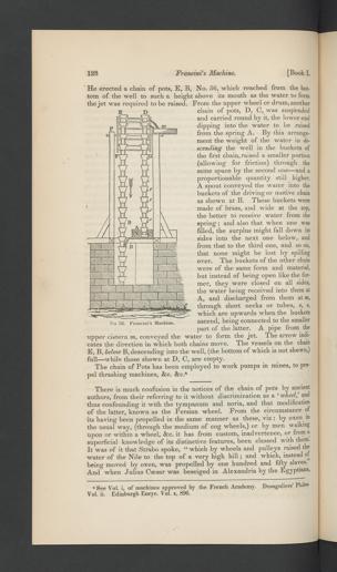 part of the latter. A pipe from theupper cistern m, conveyed the water to form the jet. The arrow indi-cates the direction in which both chains move. The vessels on the chainE, B, below B, descending into the well, (the bottom of which is not shown,)full—while those shown at D, C, are empty.