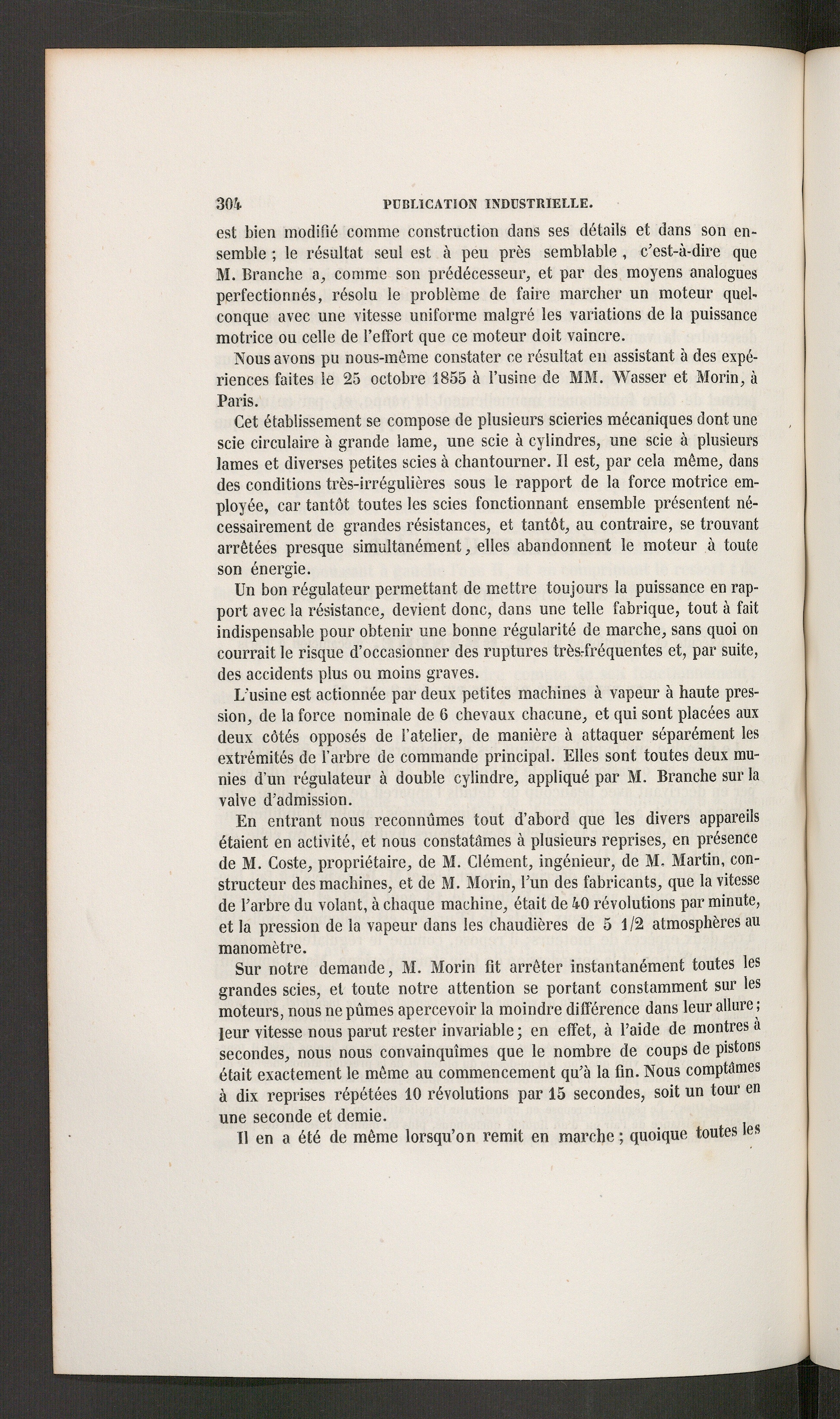 Sur notre demande, M. Morin fit arrêter instantanément toutes lesgrandes scies, et toute notre attention se portant constamment sur lesmoteurs, nous ne pûmes apercevoir la moindre différence dans leur allure ;leur vitesse nous parut rester invariable; en effet, à l’aide de montres asecondes, nous nous convainquîmes que le nombre de coups de pistonsétait exactement le même au commencement qu’à la fin. Nous comptâmesà dix reprises répétées 10 révolutions par 15 secondes, soit un tour enune seconde et demie.