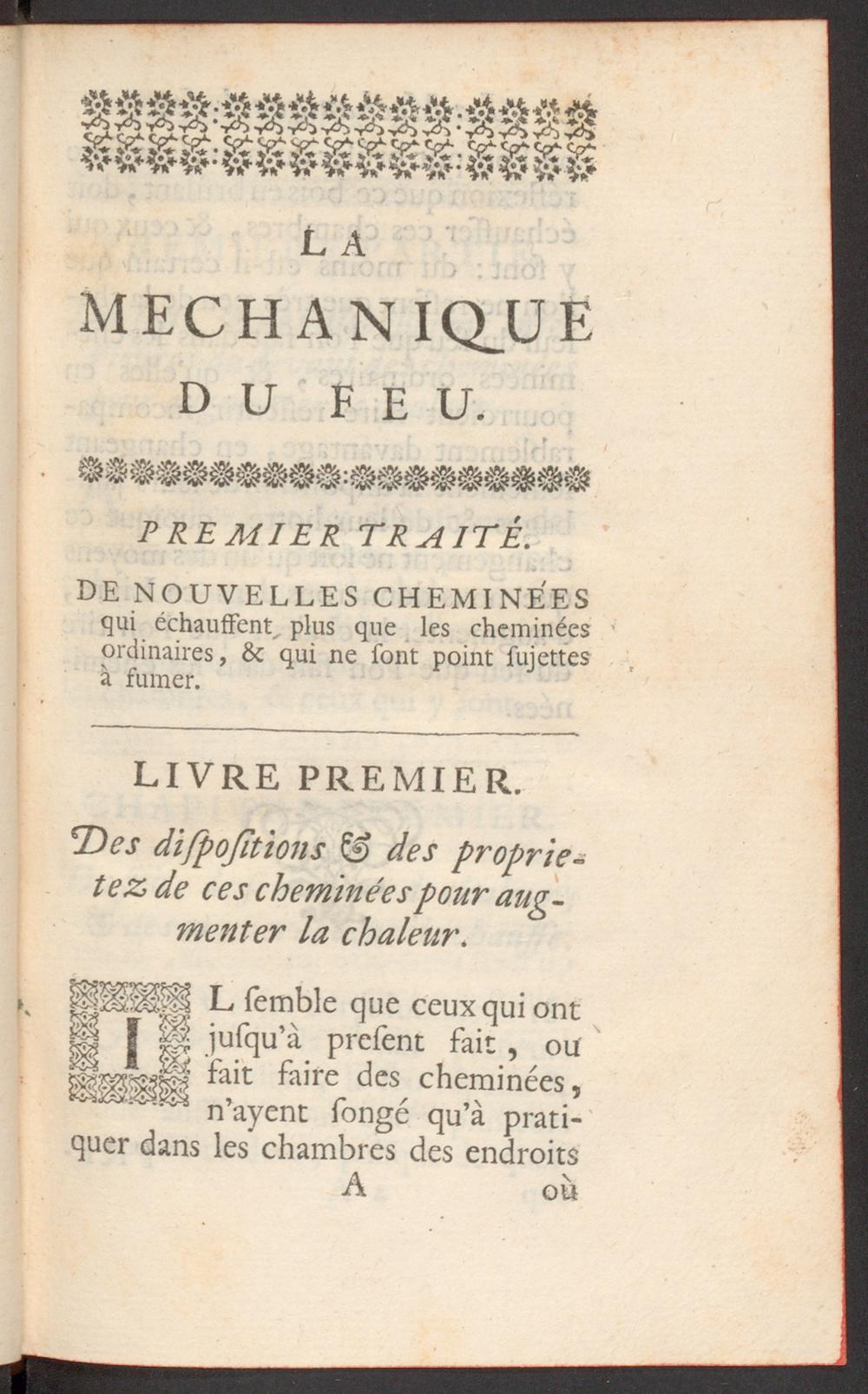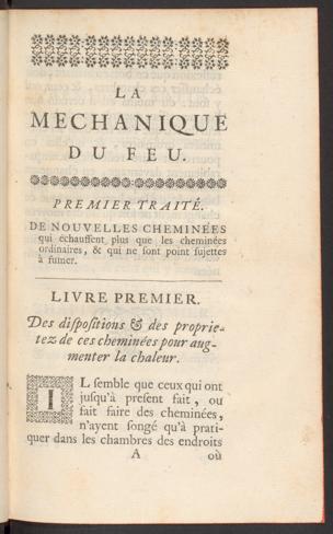 La mechanique du feu, ou l'art d'en augmenter les effets, & d'en diminuer la dépense : contenant le traité de nouvelles cheminées qui échauffent plus que les cheminées ordinaires, & qui ne sont point sujettes à fumer, &c. / par M. G***