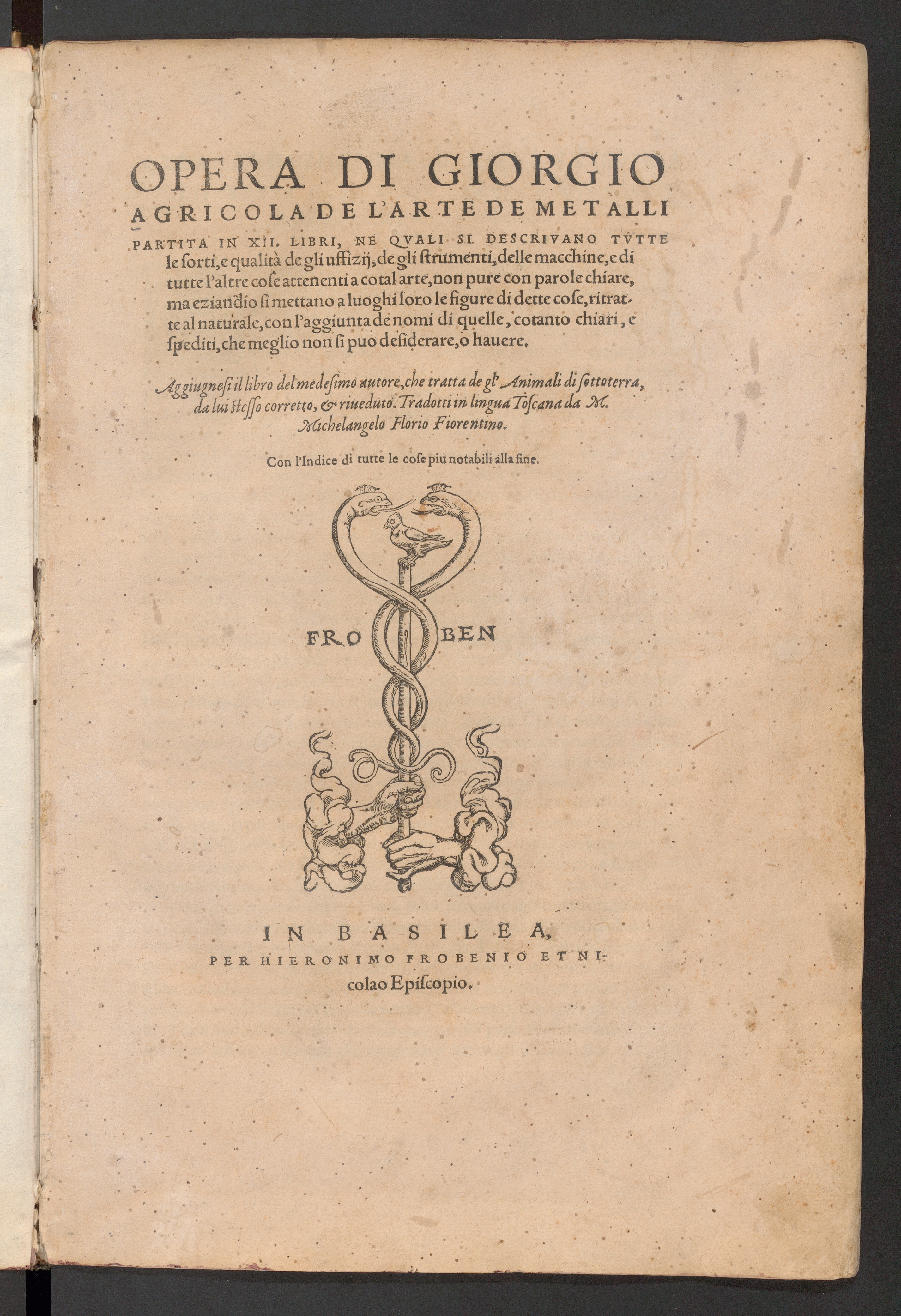 Opera di Giorgio Agricola De l'arte de metalli partita in XII. libri : ne qvali si descrivano tvtte le sorti, e qualità degli uffizij, degli strumenti, delle macchine, e di tutte l'altre cose attenenti a cotal arte ...