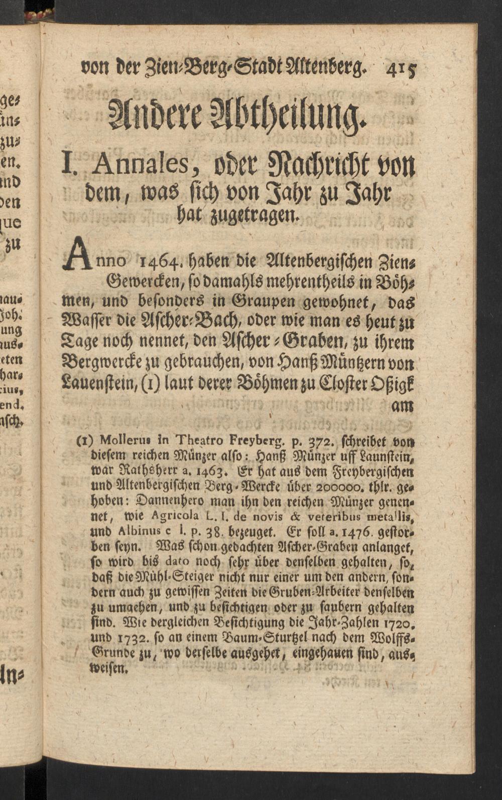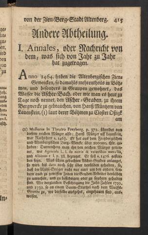 Umständliche Nachricht von der Churfl. Sächß. Schrifftsäßigen freyen Zien-Berg-Stadt Altenberg, in Meissen an der Böhmischen Gränze gelegen : nebst dahingehörigen Diplomatibus, und einem Anhange, von den benachbarten Städten und Berg-Oertern / ausgefertiget, und mit nöthigen Reg. vers. von Christoph Meißnern ...