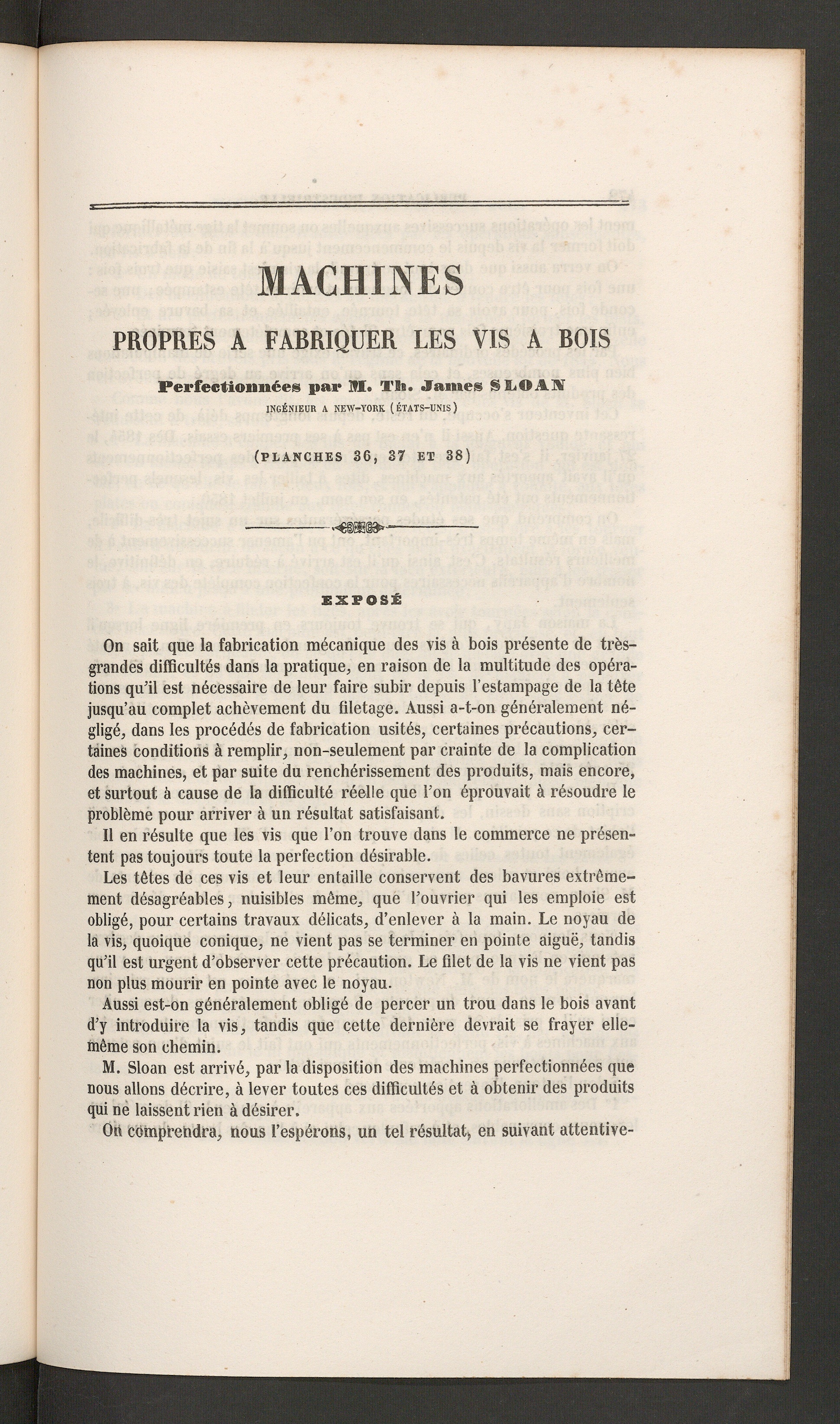 Machines propres a fabriquer les vis a bois perfectionnées par M. Th. James Sloan[...]