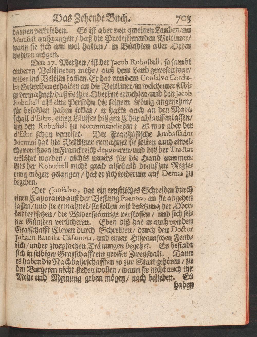 Den 27, MerßM / ist der Jacob Robustell, fo fambßWSZren Vettlineren mehr/ auß dem Land gewefm was/rvider ms DÄtlin komen. Er hat von dem Consalvo Cord««ba GcNZibm erhalten an die Mltlmer/m welchsmer ftlbi-gs vermsWek/daß sie ihre Oösrkert sewehlsn/unh dm^asoKRobuüeU alssim Perfohy die fßiMM König angenehm/für bsfohlM hah'M foüLN / Zr hatte auch an deuMamschall ä'Lürs, eivsn Länffsr biß ge» Ahm Mcmffmlaistrt/