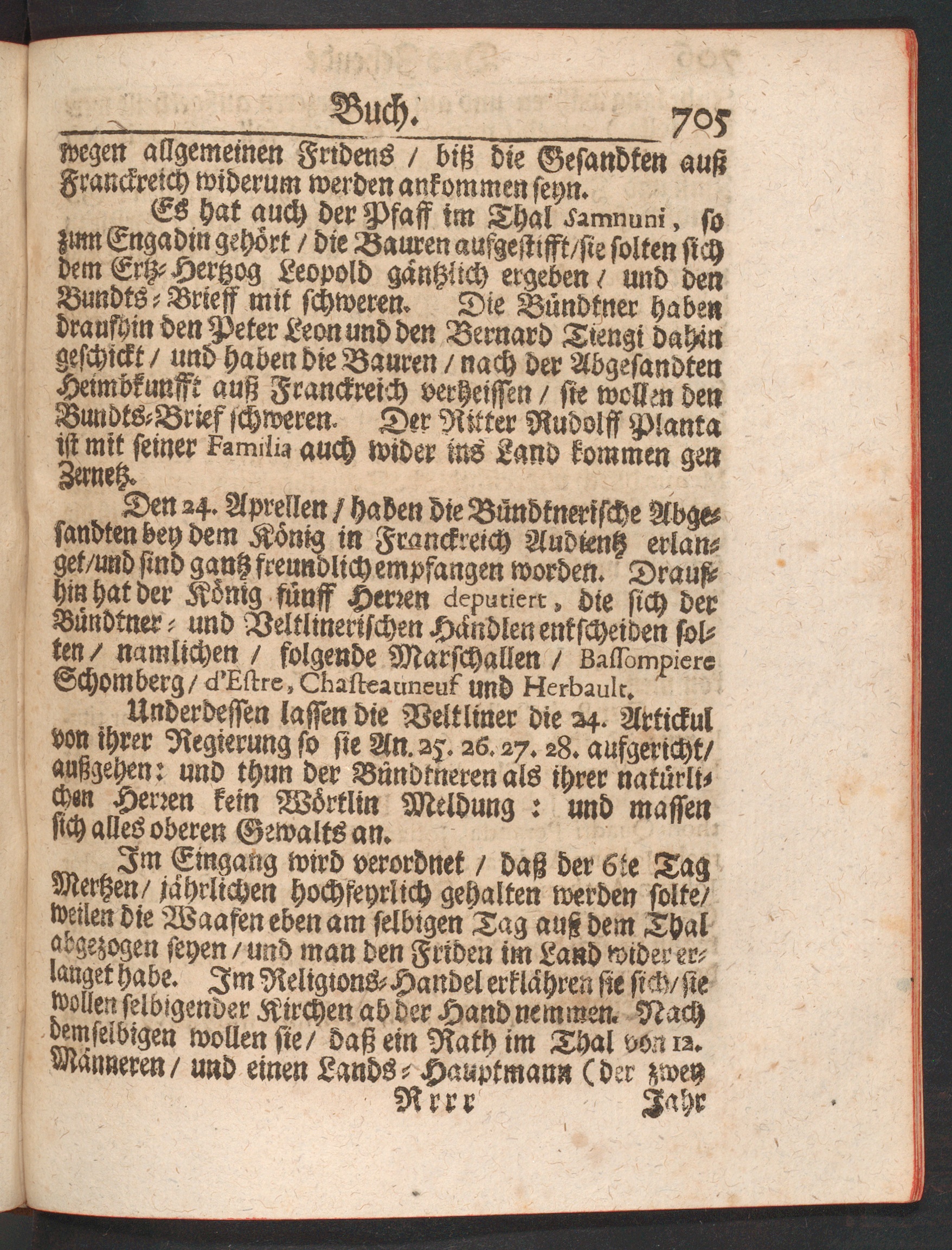 Es hat auch der Pfaff im Thal *mnuni, sozum Engadin gehört / die Bauren aufgestrsst/sie sotten sichdem Ertz-Hertzog Leopold gantzitch ergeben/ und denBundts-Brreff mit schweren. Die Bündtner habe»draufhin den Peter Leon und den Bewarb Tiengi dahingeschickt / und haben die Bauren / nach der AbgesandtenHeimbkuvfft auß Frankreich verheissen / sie wollen denBundts-Brief rchweren. Der Ritter Rudoiff Plantaist mit seiner Famiiia auch wider ms Land kommen genZernetz.