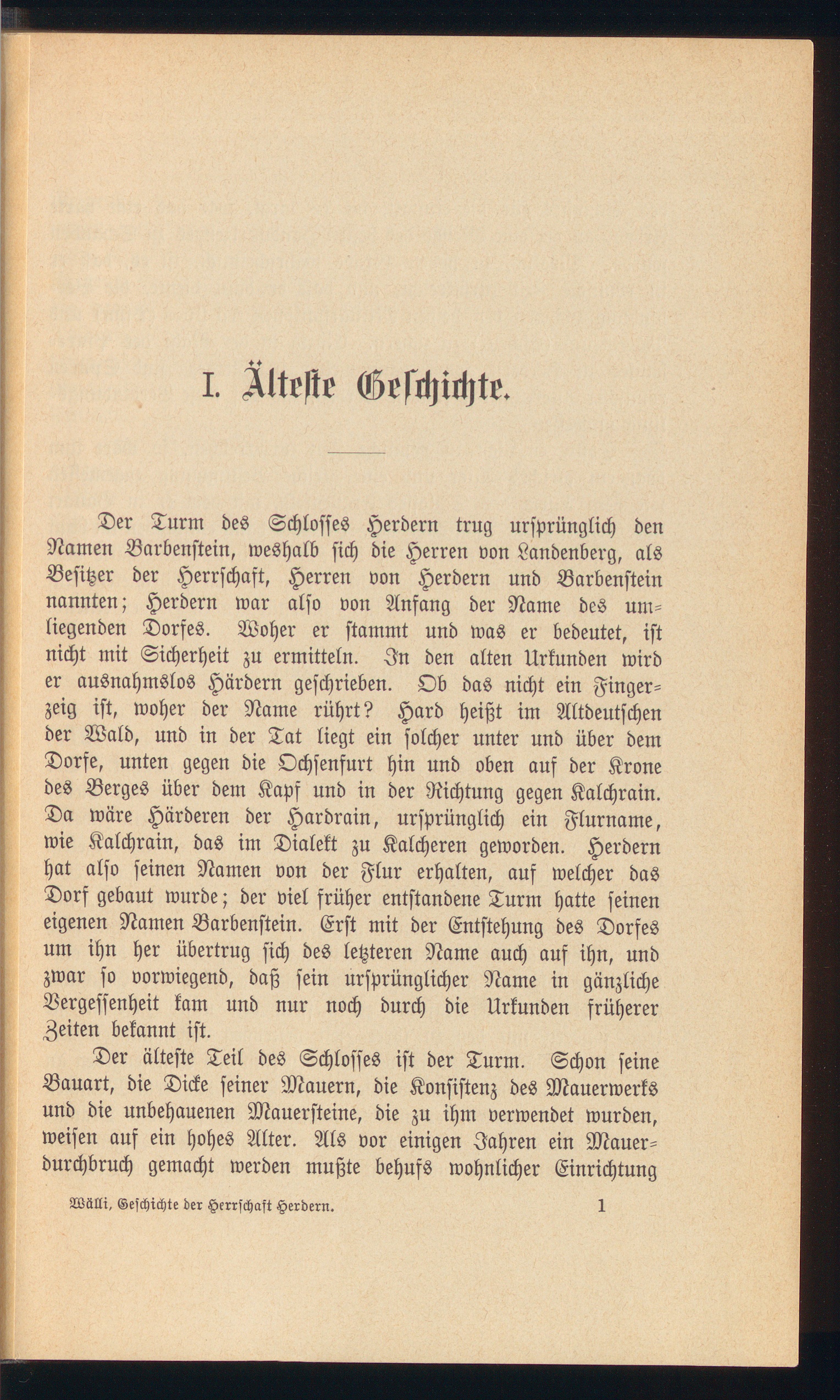 Der Turm des Schlosses Herdern trug ursprünglich denNamen Barbenstein, weshalb sich die Herren von Landenberg, alsBesitzer der Herrschaft, Herren von Herdern und Barbensteinnannten; Herdern war also von Anfang der Name des um-liegenden Dorfes. Woher er stammt und was er bedeutet, istnicht mit Sicherheit zu ermitteln. In den alten Urkunden wirder ausnahmslos Härdern geschrieben. Ob das nicht ein Finger-zeig ist, woher der Name rührt? Hard heißt im Altdeutschender Wald, und in der Tat liegt ein solcher unter und über demDorfe, unten gegen die Ochsenfurt hin und oben auf der Kronedes Berges über dem Kaps und in der Richtung gegen Kalchrain.Da wäre Härderen der Hardrain, ursprünglich ein Flurname,wie Kalchrain, das im Dialekt zu Kalcheren geworden. Herdern hat also seinen Namen von der Flur erhalten, auf welcher dasDorf gebaut wurde; der viel früher entstandene Turm hatte seineneigenen Namen Barbenstein. Erst mit der Entstehung des Dorfesum ihn her übertrug sich des letzteren Name auch auf ihn, undzwar so vorwiegend, daß sein ursprünglicher Name in gänzlicheVergessenheit kam und nur noch durch die Urkunden frühererZeiten bekannt ist.