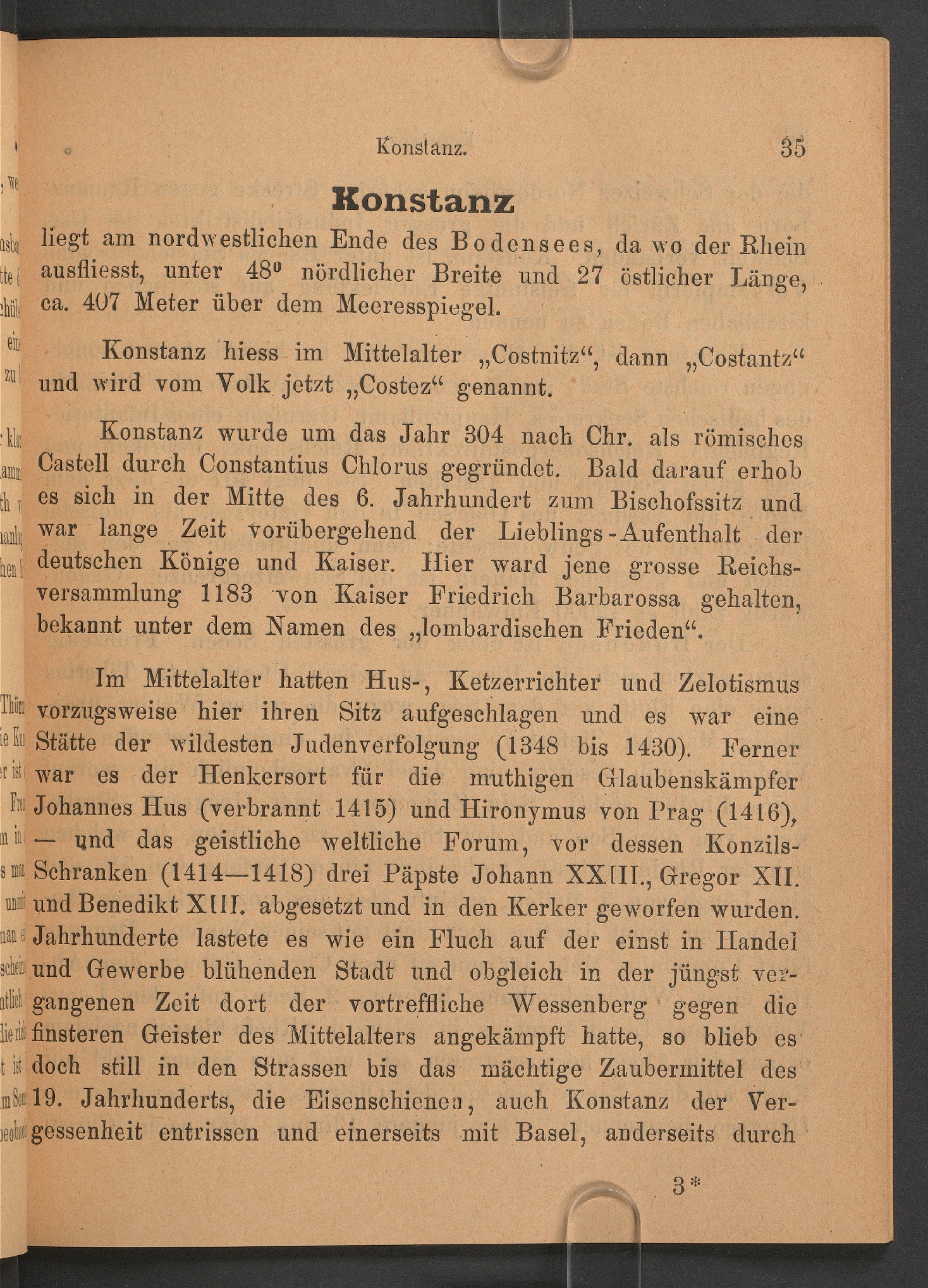 Im Mittelalter hatten Hus-, Ketzerrichter und ZelotismusTlir. vorzugsweise hier ihren Sitz aufgeschlagen und es war eine'A> Stätte der wildesten Judenverfolgung (1348 bis 1430). Ferner-war es der Henkersort für die muthigen Glaubenskämpferf® Johannes Hus (verbrannt 1415) und Hironymus von Prag (1416),mi'"— ijnd das geistliche weltliche Forum, vor dessen Konzils-s ui Schranken (1414—1418) drei Päpste Johann XX1I1., Gregor XII. las und Benedikt XIIT. abgesetzt und in den Kerker geworfen wurden,«i Jahrhunderte lastete es wie ein Fluch auf der einst in Handelick und Gewerbe blühenden Stadt und obgleich in der jüngst ver-itlitt gangenen Zeit dort der vortreffliche Wessenberg : gegen dieiici finsteren Geister des Mittelalters angekämpft hatte, so blieb est iä doch still in den Strassen bis das mächtige Zaubermittel desuh 19. Jahrhunderts, die Eisenschienen, auch Konstanz der Ver-»hgessenheit entrissen und einerseits mit Basel , anderseits durch