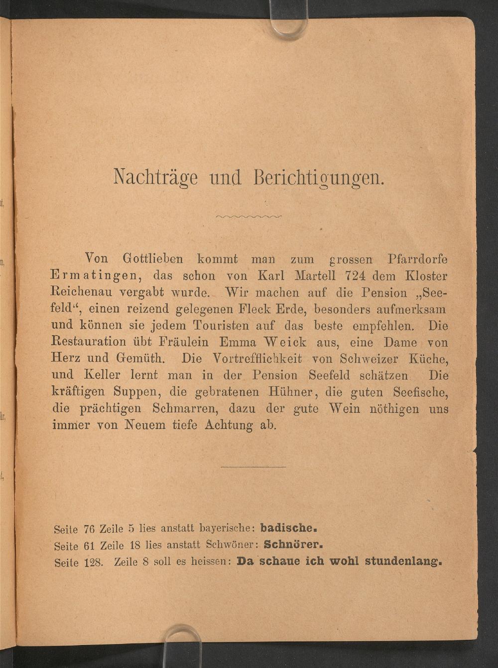 Von Gottlieben kommt man zum grossen PfarrdorfeErmatingen , das schon von Karl Kartell 724 dem Kloster Reichenau vergabt wurde. Wir machen auf die Pension „See feld 11 , einen reizend gelegenen Fleck Erde , besonders aufmerksamund können sie jedem Touristen auf das beste empfehlen. DieRestauration übt Fräulein Emma Weick aus, eine Dame vonHerz und Gemüth. Die Vortrefflichkeit von Schweizer Küche,und Keller lernt man in der Pension Seefeld schätzen Diekräftigen Suppen, die gebratenen Hühner, die guten Seefische,die prächtigen Schmarren, dazu der gute Wein nöthigen unsimmer von Neuem tiefe Achtung ab.