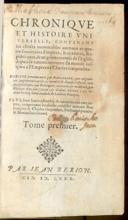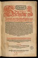 Jnn diesem werden aller Hochberuempten Teutschen Personen ... Thaten ... beschrieben, welliche durch jhre tugendt ... jhr Vatterland ... groß gemachetGetruckt zu Basel : durch Lienhart Ostein, M. D. LXXVIIIe-raraChronick: Geschichte vnd Zeitbuch aller Nam[m]hafftigsten vnd Gedechtnußwierdigsten Geystlichen vnd Weltlichen Sachen oder Handlungen von anbegin der Welt nach erschaffung des ersten Menschen/ biß auff das gegenwertige jar Christi M.D.LXXXV. verlengt