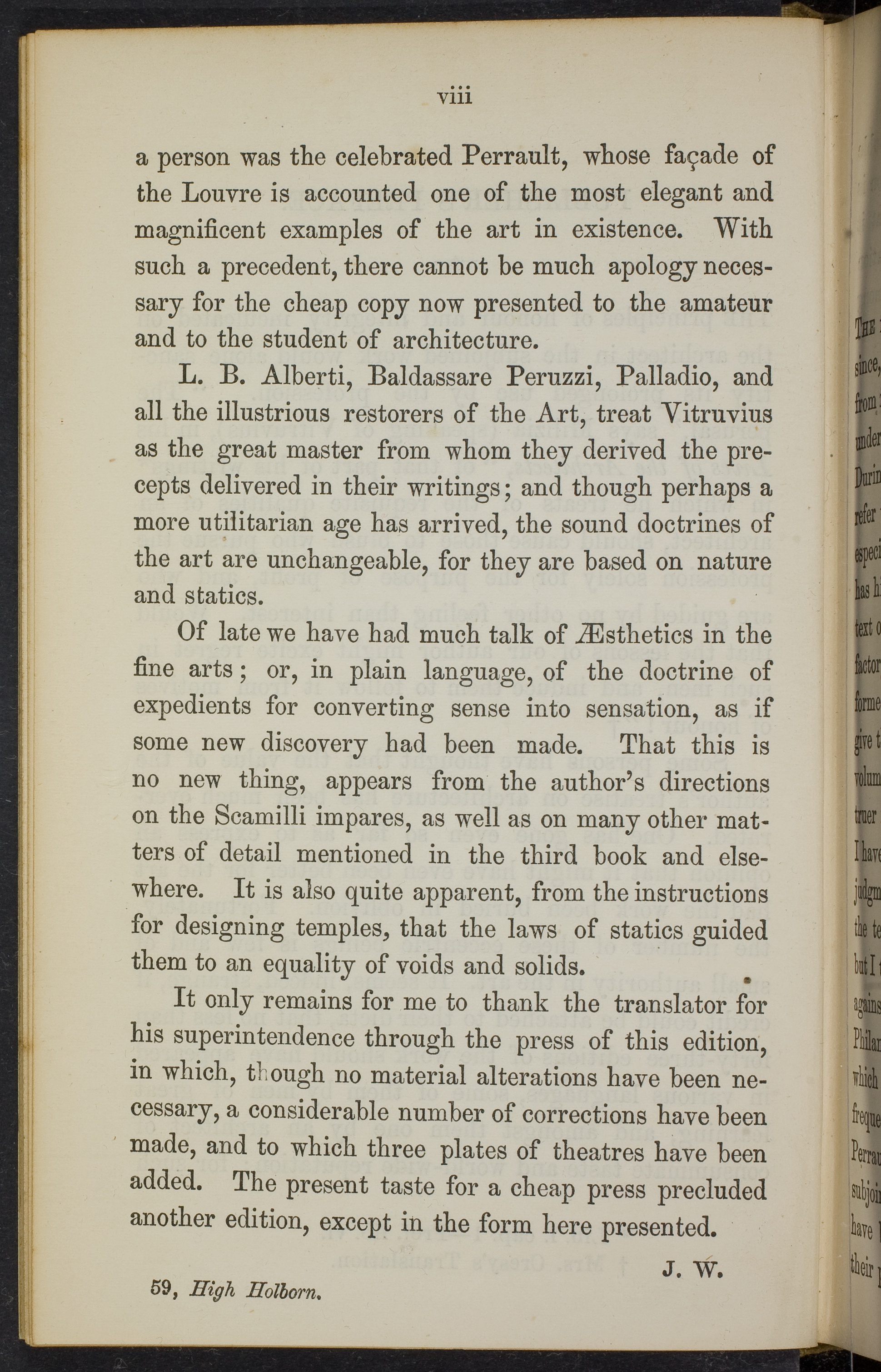 L. B. Alberti, Baldassare Peruzzi, Palladio, andall the illustrious restorers of the Art, treat Vitruviusas the great master from whom they derived the pre-cepts delivered in their writings; and though perhaps amore utilitarian age has arrived, the sound doctrines ofthe art are unchangeable, for they are based on natureand statics.