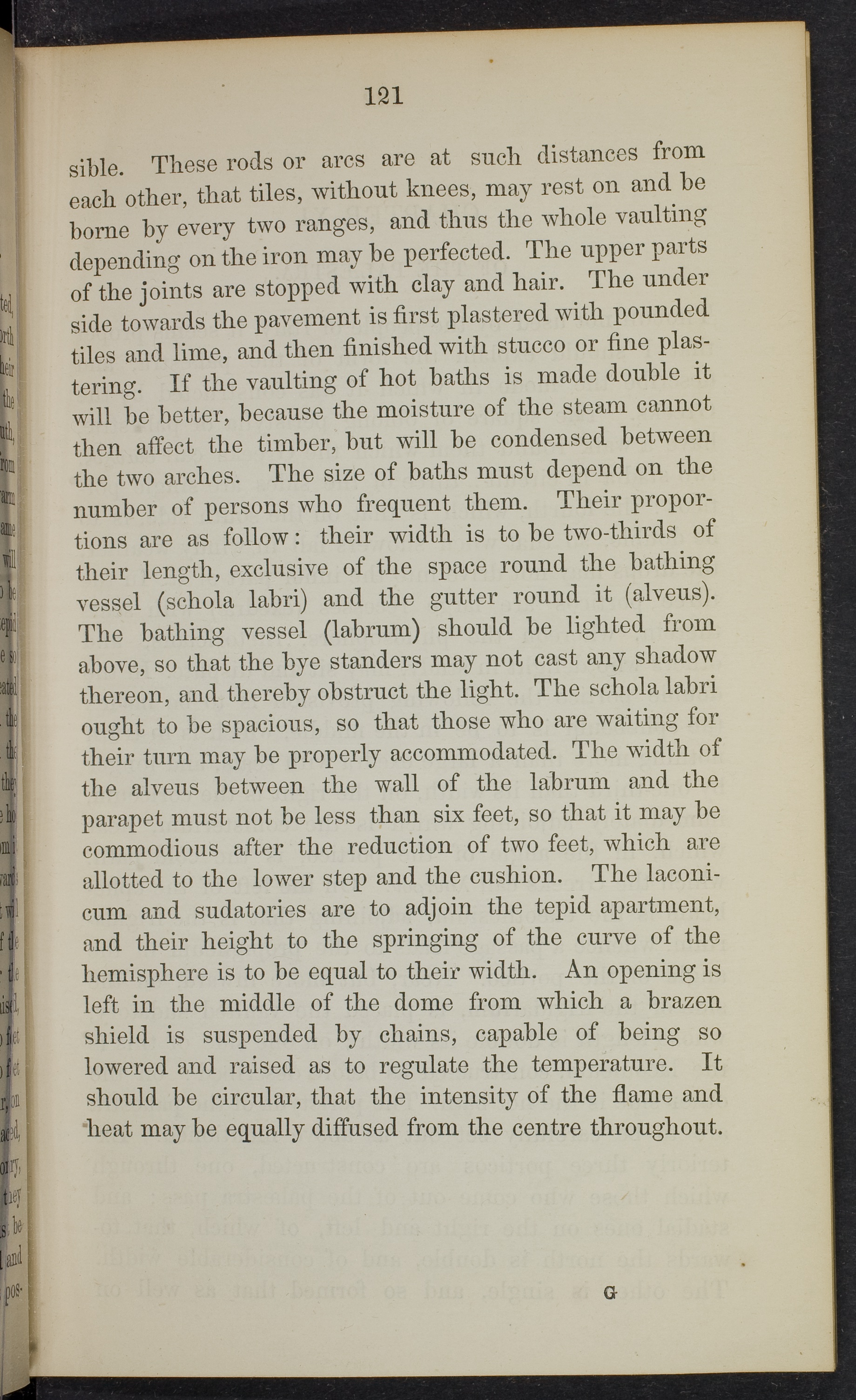 sible. These rods or arcs are at such distances fromeach other, that tiles, without knees, may rest on and hehome by every two ranges, and thus the whole vaultingdepending on the iron may he perfected. The upper partsof the joints are stopped with clay and hair. The underside towards the pavement is first plastered with poundedtiles and lime, and then finished with stucco or fine plas-tering. If the vaulting of hot baths is made double itwill he better, because the moisture of the steam cannotthen affect the timber, hut will he condensed betweenthe two arches. The size of baths must depend on thenumber of persons who frequent them. Their propor-tions are as follow: their width is to he two-thirds oftheir length, exclusive of the space round the bathingvessel (schola labri) and the gutter round it (alveus).The bathing vessel (labrum) should he lighted fromabove, so that the bye standers may not cast any shadowthereon, and thereby obstruct the light. The schola labriought to he spacious, so that those who are waiting fortheir turn may he properly accommodated. The width ofthe alveus between the wall of the lahrum and theparapet must not be less than six feet, so that it may becommodious after the reduction of two feet, which areallotted to the lower step and the cushion. The laconi-cum and sudatories are to adjoin the tepid apartment,and their height to the springing of the curve of thehemisphere is to be equal to their width. An opening isleft in the middle of the dome from which a brazenshield is suspended by chains, capable of being solowered and raised as to regulate the temperature. Itshould be circular, that the intensity of the flame and"heat may be equally diffused from the centre throughout.