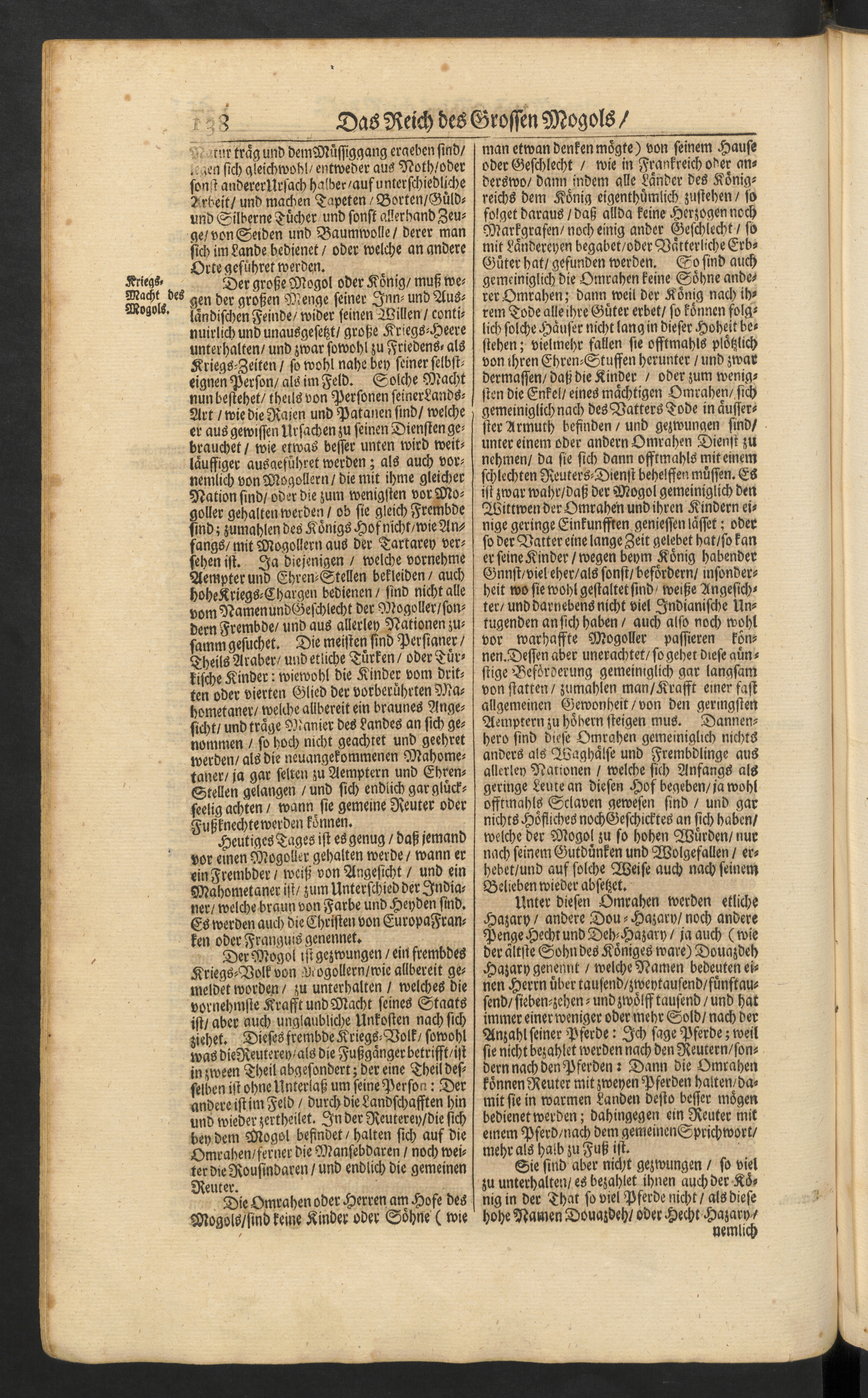 Asia, oder, Ausführliche Beschreibung des Reichs des Grossen Mogols und eines grossen Theils von Indien : an sich haltend die Landschafften Kandahar, Kabul, Multan, Haikan, Bukkar, Send oder Diu, Jesselmeer, Attak, Peniab, Kaximir, Jangapore, Dely, Mando, Malva, Chitor, Utrad, Zuratte oder Kambaye, Chandisch, Narvar, Gwaliar, Indostan, Sambat, Bakar, Nagrakat, Dekan und Visiapour : nebenst einer vollkommenen Vorstellung des Königreichs Persien, wie auch Georgien, Mengrelien, Cirkassien und anderer benachbarten Länder : zusamt deren verschiednen Namen, Grenzen, Städten, Gewächsen, Thieren, Sitten, Trachten, Regierung und Gottesdienst : durchgehends mit schönen Kupfern, als Landcharten und Abrissen der fürnemsten Städte, Trachten, Thieren und Gewächsen ... aussgezieret / zusammgetragen durch O. Dapper D., anitzo aber ins Hochteutsche getreulichst übersetzet von Johann Christoff Beern