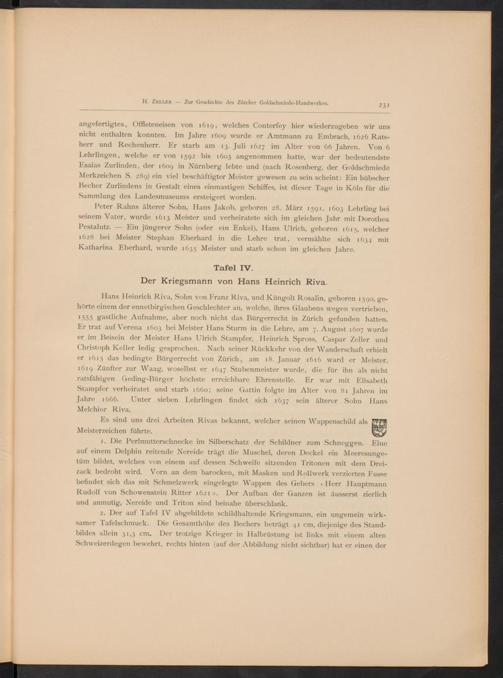 Hans Heinrich Riva, Sohn von Franz Riva, und Küngolt Rosalin, geboren 1590, ge-hörte einem der ennetbirgischen Geschlechter an, welche, ihres Glaubens wegen vertrieben,1 555 gastliche Aufnahme, aber noch nicht das Bürgerrecht in Zürich gefunden hatten.Er trat auf Verena 1603 bei Meister Hans Sturm in die Lehre, am 7. August 1607 wurdeer im Beisein der Meister Hans Ulrich Stampfer, Heinrich Spross, Caspar Zeller undChristoph Keller ledig gesprochen. Nach seiner Rückkehr von der Wanderschaft erhielter 1615 das bedingte Bürgerrecht von Zürich , am 18. Januar 1616 ward er Meister,1619 Zünfter zur Waag, woselbst er 1647 Stubenmeister wurde, die für ihn als nichtratsfähigen Geding-Bürger höchste erreichbare Ehrenstelle. Er war mit ElisabethStampfer verheiratet und starb 1660; seine Gattin folgte im Alter von 81 Jahren imJahre 1666. Unter sieben Lehrlingen findet sich 1637 sein älterer Sohn HansMelchior Riva.