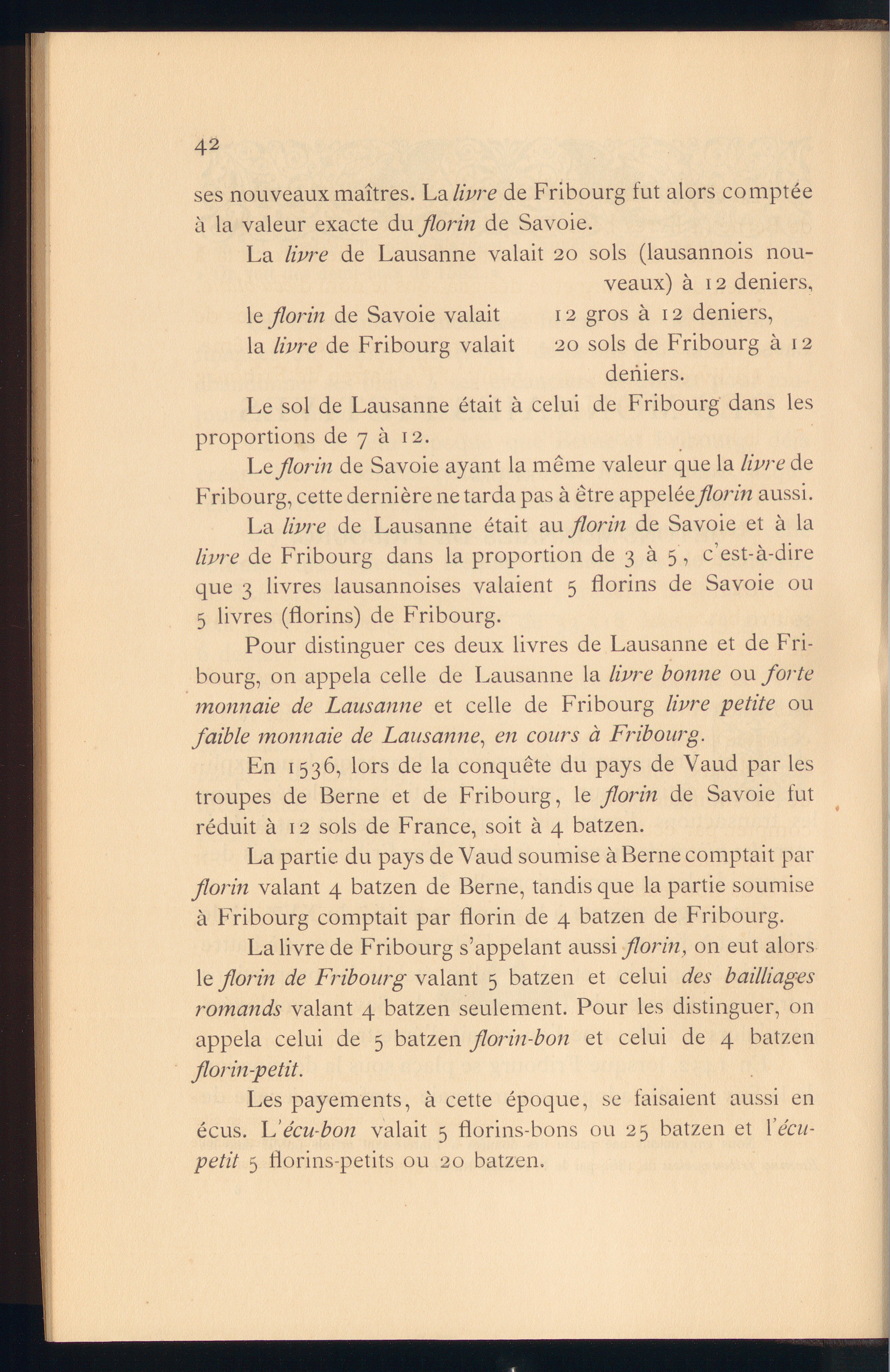 La livre de Lausanne était au florin de Savoie et à lalivre de Fribourg dans la proportion de 3 à 5, c’est-à-direque 3 livres lausannoises valaient 5 florins de Savoie ou5 livres (florins) de Fribourg .