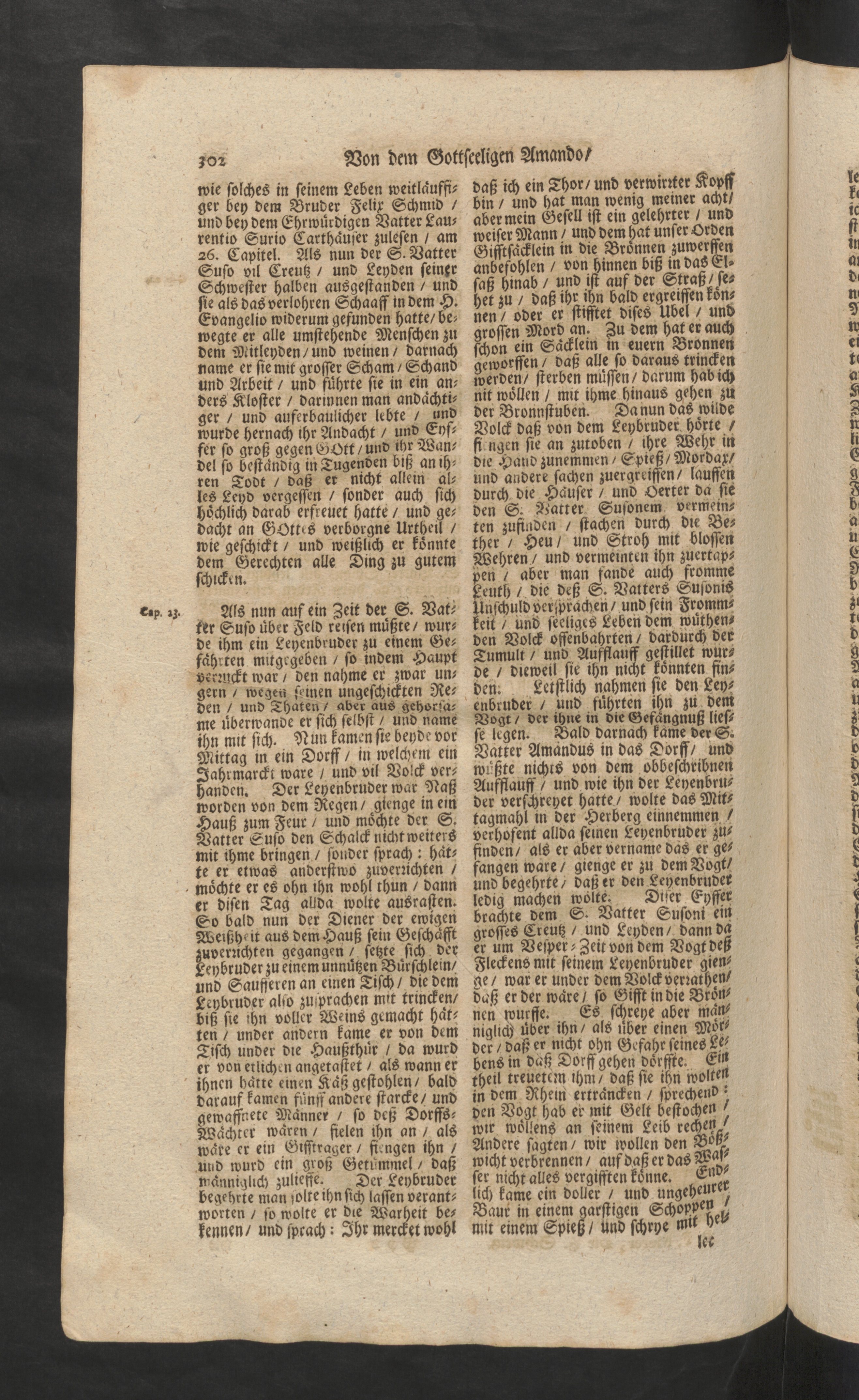 keuch / die deß S. Valters SusonisAls nun auf ein Zeit der S. Vat- Unschuld verjpracken/ und sein Frömm-ler Suso über Feld reisen müßte/ wur- keil / und fertiges Lebendem wüthen-de ihm ein Leyenbruder zu einem Ge- den Volck offenbahrten / dardurch derfährten mitgegeben / so indem Haupt Tumult / und Aufflauff gestittet wur-verrnckt war / den nähme er zwar um de / dieweil sie ihn nicht könnten fin-gern / wegen seinen ungeschickten Re- den. Letstlich nahmen sie den Ley-den / und Thaten / aber aus gehorsar cnbruder / und führten ihn zu demme überwände er sich selbst / und name Vogt/ der ihne m bieGefängnuß lies-ihn mit sich. N un kamen sie beyde vor se legen. Bald darnach käme der S.Mittag in ein Dorff / in welchem ein Vatter Amändus in das Dorff/ undIahrmarckc wäre / und vil Volck vcr- wüßte nichts von dem obbeschribnenHanden. Der Leyenbruder war Naß Aufflauff / und wie ihn der Leyenbru-worden von dem Regen/ gienge mein der verschreyet hatte/ wolle dasMit-Hauß zum Feur / und möchte der S. tagmahl in der Herberg einnemmen /Vatter Suso den Schalck nicktweiters verhofent allda seinen Leyenbruder zu-mit ihme bringen / solider sprach : hüt- finden/ als er aber vername das er ge-te er etwas anderstwo zuverrichten / fangen wäre / gienge er zu dem Vogt/möchte er es ohn ihn wohl thun / dann und begehrte/ daß er den Leyenbruderer Visen Tag allda wolle ausrasten, ledig machen wolle. Dner Eyffec
