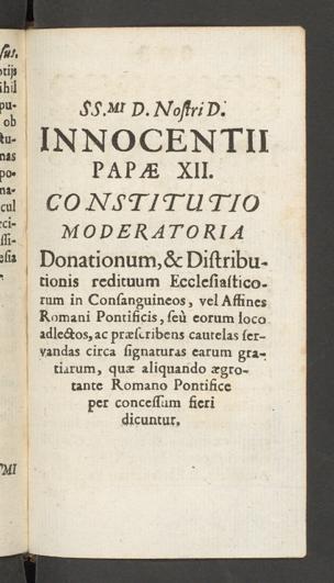 Donationum,& Distribu-tionis redituum Ecclesiastico-rum in Consanguineos, vel AffinesRomani Pontificis, seu eorum locoadlectos, ac proscribens cautelas ser-vandas circa signaturas earum gra-tiarum, quo aliquando ogro-tante Romano Pontificeper concessum fieridicuntur.