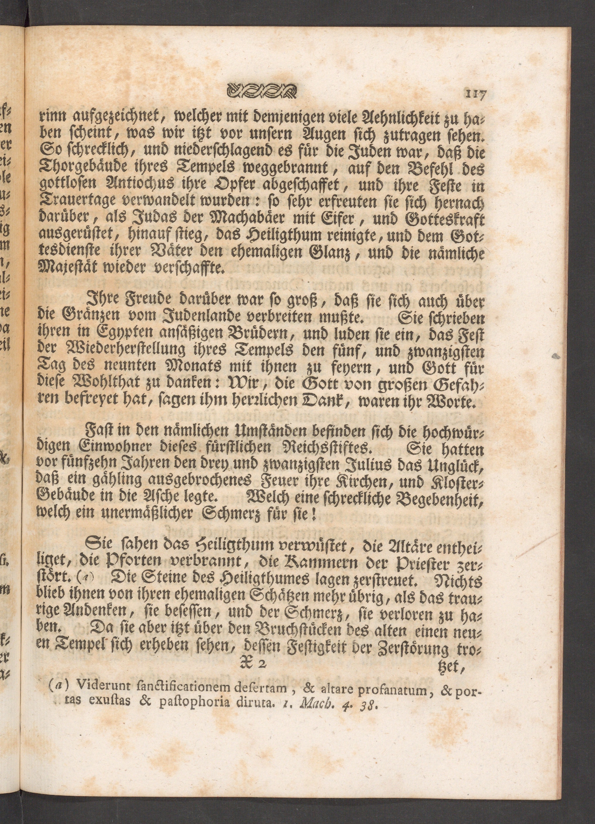 rinn aufgezeichnet, welcher mit demjenigen viele Aehnlichkeit zu ha-ben scheint, was wir itzt vor unsern Augen sich zutragen sehen.So schrecklich, und niederschlagend es für die Juden war, daß dieThorgebäude ihres Tempels weggebrannt, auf den Befehl desgottlosen Antiochus ihre Opfer abgeschaffet, und ihre Feste inLrauertage verwandelt wurden : so sehr erfreuten sie sich hernachdarüber, als Judas der Machabäer mit Eifer, und Gotteskraftausgerüstet, hinaufstieg, das Heiligthum reinigte,und dem Got-tesdienste ihrer Vater den ehemaligen Glanz, und die nämlicheMajestät wieder verschaffte.