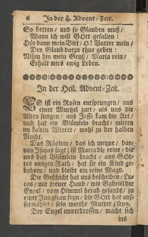 ist ein Rosen entsprungen/ auseiner Wurtzel zart/ als uns dirAlten sungen/ aus Jesse kam die Art/und hat ein Blümlein bracht/ mittenim kalten Winter / wohl zu der halbenNacht.