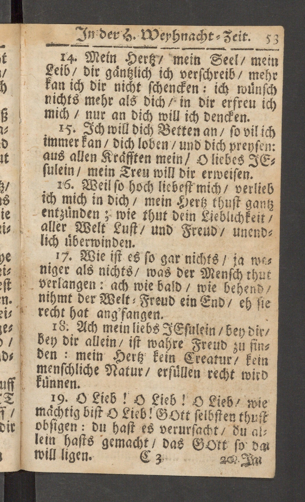 st i 4 - Mein Hertz/ mein See!/ meint/ Leib/ dir güntzlich ich verschreib / mehrh kan ich dir nicht scheuchen - ich wünschnichts mehr als dich /in dir erfreu ichß i mich / nur an dich will ich dencken.v r^. Ich will dich Betten an/so vil ichd immer kan / dich loben / und dich preyscn:zt aus allen Kra'fften mein/ Q liebes IE-sulein/ mein Treu will dir erweisen.y rS. Weil so hoch liebest mich/ verliebich mich in dich / mein Hertz thust gantzje entzünden ; wie thut dein Lieblichkeit/»i# . aller Welk Lust/ und Freud/ unend-lich überwinden.