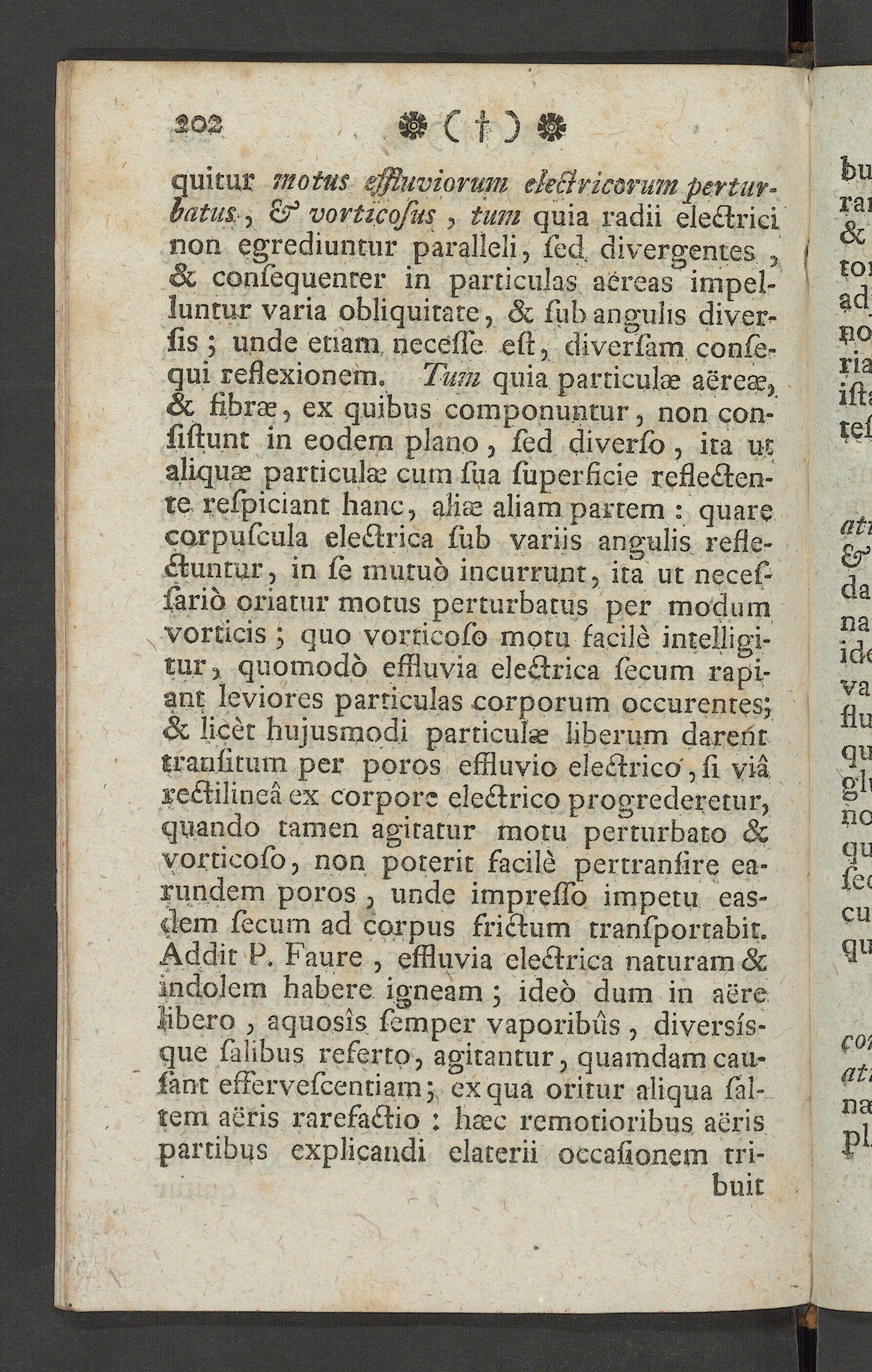 quitur motus effluviorum ele£t ricarum pertur-batus, , vorticosus , tum quia radii electricinon egrediuntur paralleli, sed, divergentes ,& consequenter in particulas aereas impel-luntur varia obliquitate, & sub angulis diver-sis ; unde etiam necesse est, diversam conse-qui reflexionem. Tum quia particulae aerea?,& fibra?, ex quibus componuntur, non con-sistunt in eodem plano , sed diverse» , ira utaliqute particula? cum sua superficie reflecten-te respiciant hanc, alia? aliam partem : quarecarpuseula electrica sub variis angulis refle-ctuntur, in se mutuo incurrunt, ita ut neces-sario oriatur motus perturbatus per modumvorticis ; quo vorticoso motu facile intelligi-tur, quomodo effluvia electrica fecum rapi-ant leviores particulas corporum occurentes;& licet hujusmodi particula? liberum darenttransitum per poros effluvio electrico,si viarectilinea ex corpore electrico progrederetur,quando tamen agitatur motu perturbato &vorticoso, non poterit facile pertranlire ea-rundem poros, unde impresso impetu eas-dem fecum ad corpus frictum transportabit.Addit P. Faure , effluvia electrica naturam &indolem habere igneam ; ideo dum in aerelibero , aquosis semper vaporibus , diversfs-que salibus referto, agitantur, quamdamcau-sent effervescendam; ex qua oritur aliqua sel-ten! aeris rarefactio : ha?c remotioribus aerispartibus explicandi elaterii occasionem tri-
