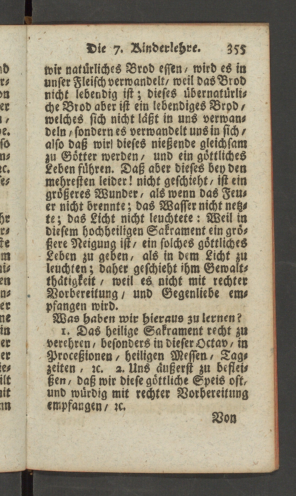 1. Das heilige Sakrament recht zuverehren, besonders in dieser Octav, inProceßioneo / heiligen Messen, Tag,zeiten, rc. 2. Uns äußerst zu beflei-ßen, daß wir diese göttliche Speis oft,und würdig mit rechter Vorbereitungempfangen/ rc.