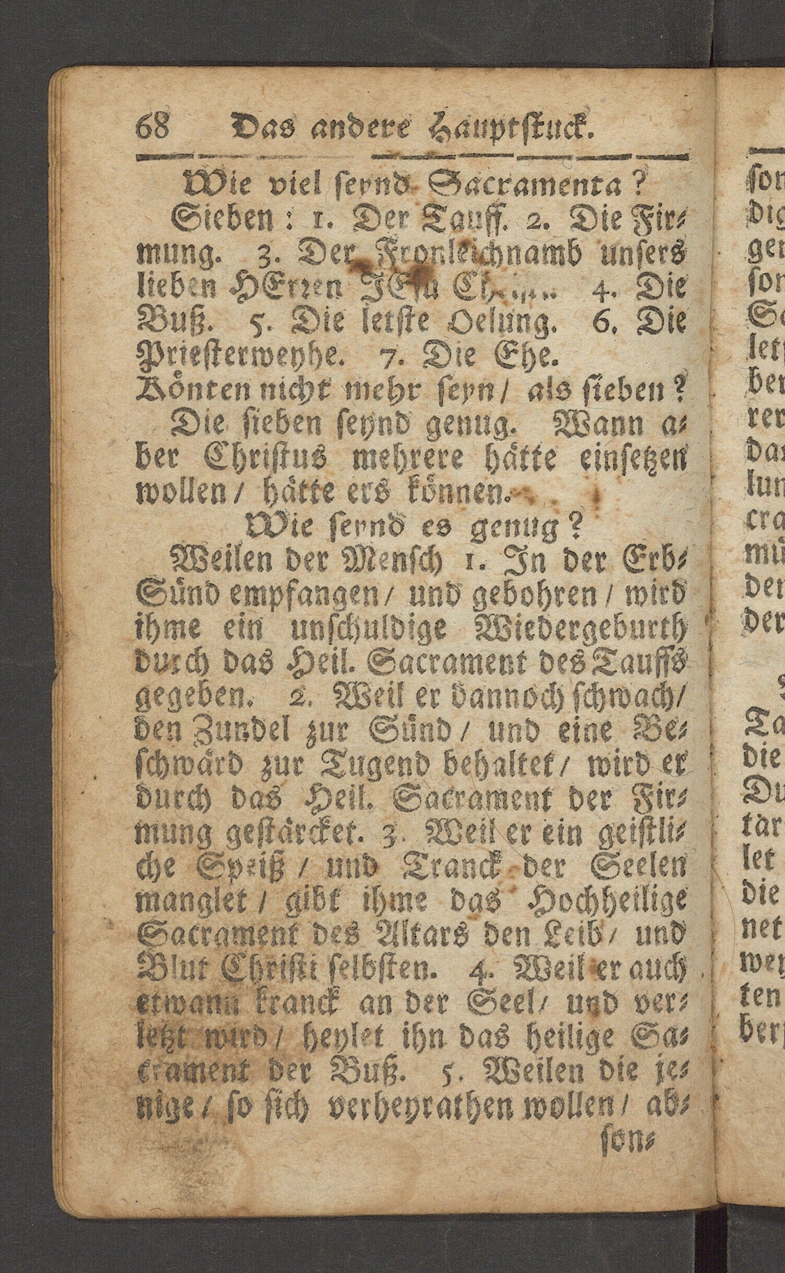 Weilen der Mensch i. In der Erb-Sünd empfangen/ und gebohren/ wirdihme ein unschuldige Wiedergeburthdurch das Heil. Sacrament desLauffsgegeben. L. Weil er öannoch schwach/denZundel zur Sänd/ und eine Be-schward zur Tugend behaltet/ wird erdurch das Heil. Sakrament der Fir-mung gestärcket- z Weil er ein geistli-che Spejß / und Tranck der Seelenmanglet / gibt ihme das 'HochheiligeSakrament des Altars" den Leib/ undBlut Christi sechsten. 4. Weihrauchermann kranck an der See!/ und ver-letzt-.Mrd / heyl-t ihn das heilige Gart-ament der Büß. 5. Weilen die je-kiige / so sich verhebrathen wollen / ab-