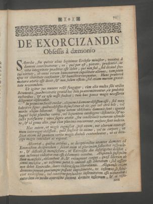 In primis ne facite credat , aliquem ddamone obfestum este, sed notahabeat ea figna 7 quibus obfestiis dignoscitur ab iis ^qui vel atra bile , velmorbo aliquo laborant. Signa autem oblidentis damonis Junt: ignotalingua loqui pluribus verbis , vel loquentem intelligere: distantia stf oc-culta patefacerevires supra cetatis y feu conditionis naturam ostende-re , Hf id genus alia , quce cum plurima concurrunt , majora sunt indicia.