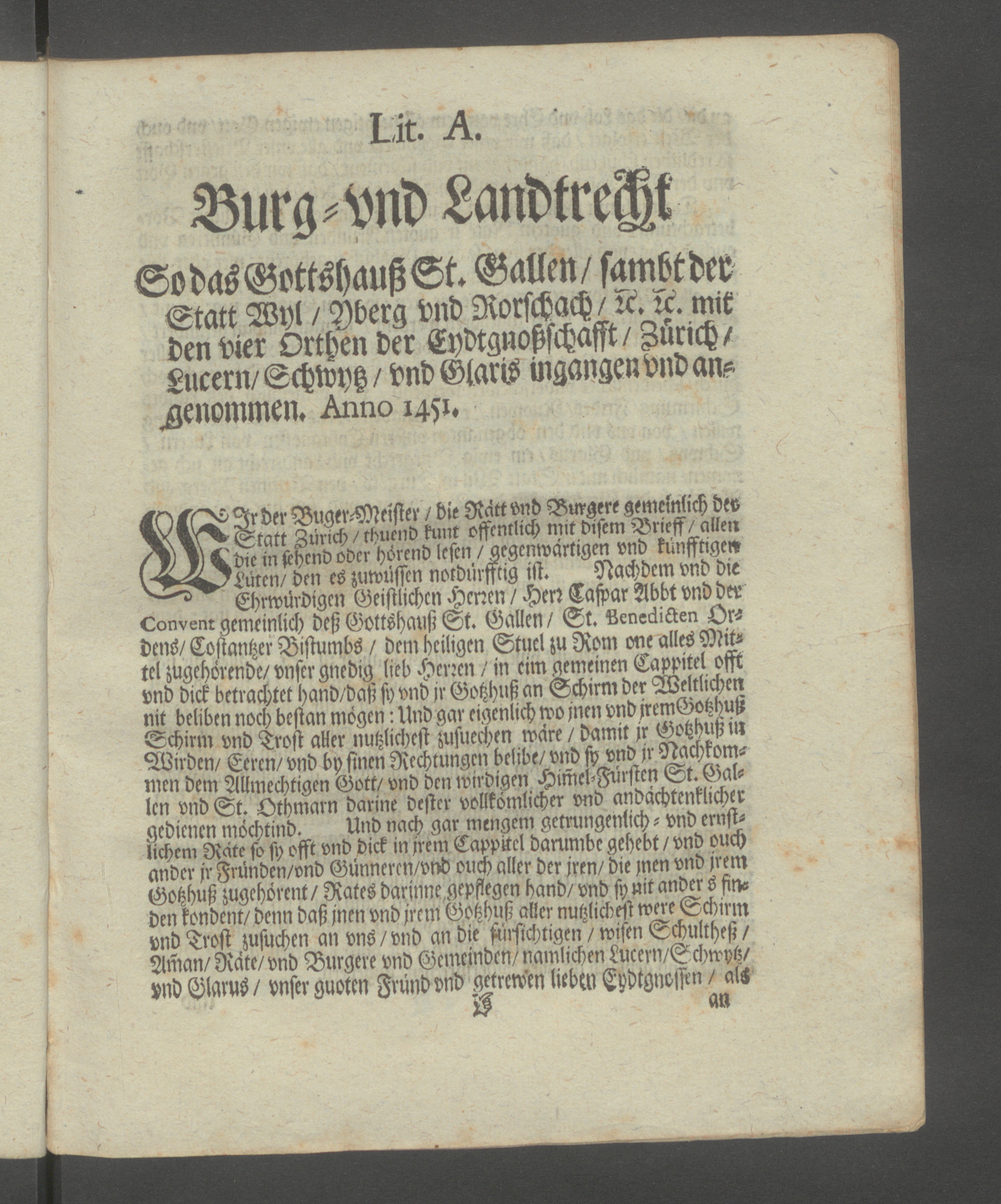 JrderBugeiMeister / die Rättvnd Bürgere gemelnlich drvStatt Zürich / chuend kunt öffentlich mit disem Vrieff/ allendie in sehend oder hörend lesen / gegenwärtigen vnd künfftigenLüren/ den es zuwüsscn nokdürffkig ist. Nachdem vnd dieEhrwürdigen Geistlichen Herren / Herr Caffar Abbt vnd derconvsnrgemeinlich deß Gottshauß St. Gallen/ St. venesticken Or?dens/Costantzer Vistumbs / dem heiligen Stucl zu Rom one alles Mit-tel zugehörende/vnsergnedig lieb Herren / in cim gemeinen Cappitel offtvnd dick betrachtet hand/daß sy vnd jr Gotzhuß an Schimr der Weltlichennit beliben noch bestan mögen: Und gar eigcnlich wo jnen vnd jremGotzhußSchirm vnd Trost aller nutzlichest zusnechen wäre / damit jr Gotzhuß inWirdcn/ Eercn/ vnd bp sinen Rechlungen bclibe/ vnd sy vnd jr Nachkom-men dem Mmechtigen Gott/ vnd den wirdigen Himel-Fürsten St. Gal-len vnd St. Othmarn darine destcr vollkömlicher vnd andächtenklichcrgrdienen möchtind. Und nach gar mengem getrungenlich - vnd ernst-lichem Räte so sy offt vnd dick in jrem Cappitel dammbe gehebt / vnd ouchander jr Fründen/vnd Günneren/vr»d ouch aller der jren/ die inen vnd jremGotzhuß zugehörent/ Rates darjnne gepflegen Hand/ vnd synit ander s fin-den kondent/ denn daß jnen vnd jrem Gotzhuß aller nutzlichest were Schinnvnd Trost zusuchen an vns/vnd an die stnstchtigen / wisen Schultheß /Man/ Räte/vnd Bürgere vnd Gemeinden/ nämlichen Luccm/Schwptz/vnd GiaruS/ vnser guoten Fründvnd getrew'en liebw Eydtgnoffn / als