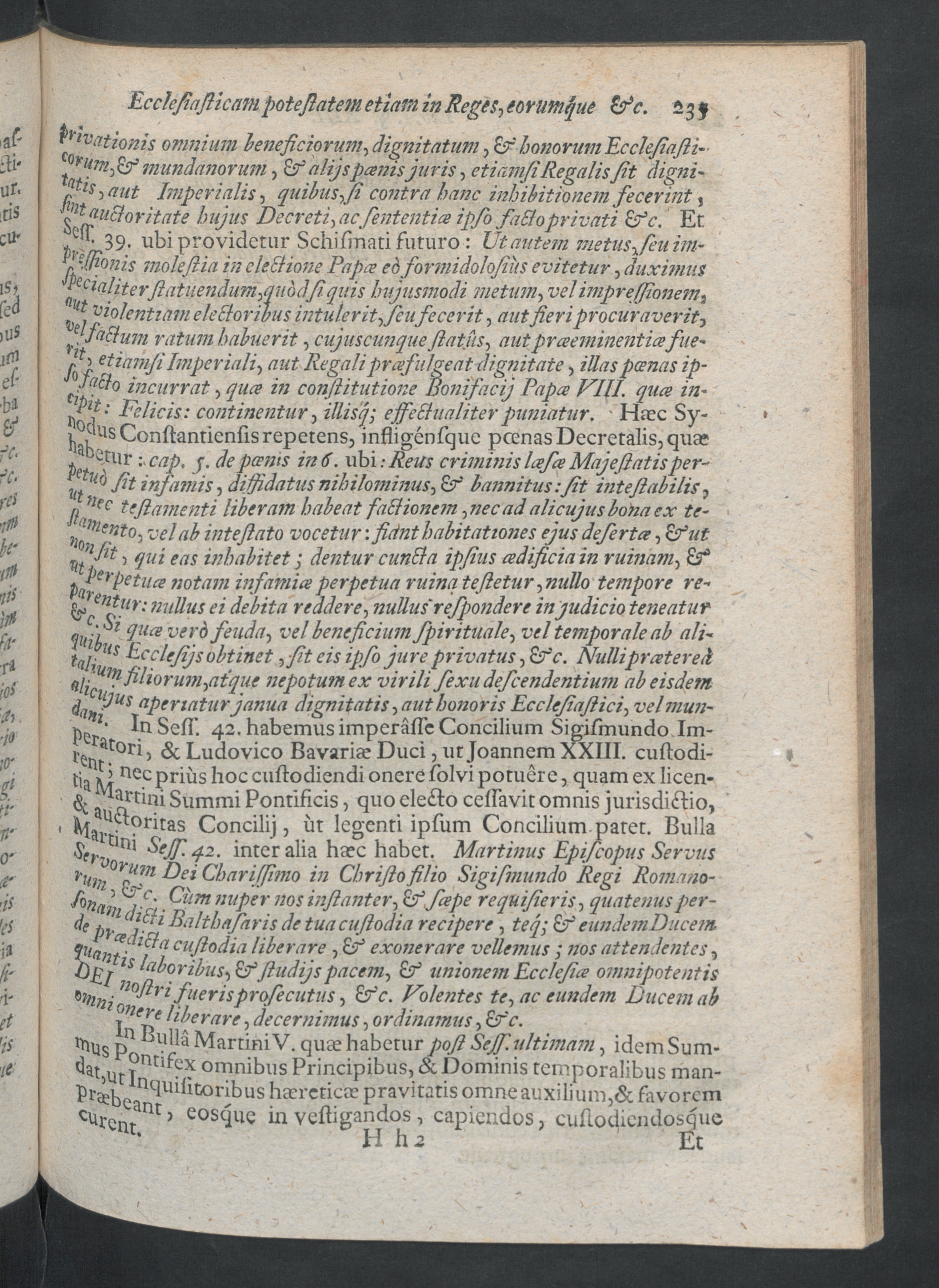 , qui eas inhabitet; dentur cunEta ipfius cedificiain ruinam, &*pP er petuce notam infamia perpetua ruina tefietur, nullo tempore re-& et 2 j Ur -' nullus ei debita reddere, nullus refpondere in judicio teneatur‘lu h ^ llce ver ^ f eu ^ a i ve t beneficium fpirituale, vel temporale ab ali-t a fo Us Ecclefijs obtinet ,fit eis ipfo jure privatus, £Pc. Nulliprat er e dQh Ulr l filiorum,atque nepotum ex virili fexu defeendentium ab eisdemd a *y us aperiatur janua dignitatis, aut honoris Ecclefiaftici, velmun-p *• In Sefi*. 42 . habemus imperaffe Concilium Sigifinundo Im-**°ri, &Ludovico Bavariae Duci, ut Joannem 50(111. cuftodi-tiaivi Ucc P r ^ s h° c cuftodiendi onere folvi potuere, quam ex Iicen-^®rtini Summi Pontificis, quo ele&o celfavit omnis jurisdiftio,