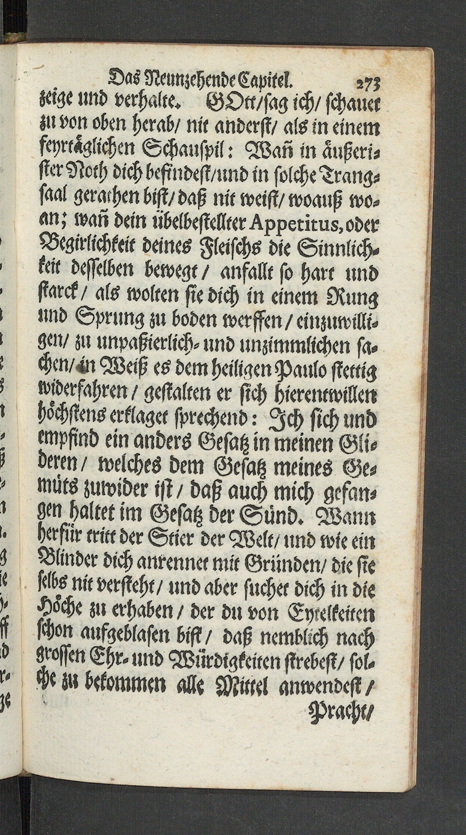 Das Neunzchende Capitel. ry;zeige und verhalte. GOtt/sag ich/ schauerzu von oben herab/ nit änderst/ als in einemfeyrtaglichen Schauspil: Wan in außen-ster Noch dich befindest/und in solche Trang-saal gerathen bist/daß nit weist/woanß wo-an; wan dein «belbestellter^pxeriru8,oderBegirlichkeit deines Fleischs die Sinnlich-keit desselben bewegt / anfallt so harr undstarck/ als wollen sie dich in einem Rungt und Sprung zu boden werffen / einzuwilli-