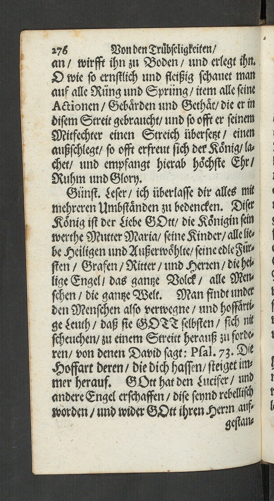 O wie so ernstlich und fleißig schauet manauf alle Rung und Sprung / item alle seine^üionen/ Gebärden und Gechac/die er indisem Streik gebraucht/ und so offk er seinem iMitfechter einen Streich überseht/ einen laußschlegt/ so ojft erfreut sich der König/ la- !chet/ und empfangt hierab höchste Ehr/ !Ruhm undGlory. J