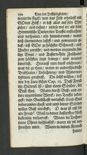 wann dn stgest/ rrnd das Feld erhaltest mit !GOttes Hilff / er diß alles auf fern Ehre ;liehet/ und richtet/ und so wol er/als seine ;Himmelische Diener/den Trüffel auslachen/ 'und verspotten / also hinwiderumb/ wann 1dich überwinden lassest / und gewunnen gi» !best / diß GOtt zu höchster Schmach / und ^Unehre gereicht / und werden angemelte hei. !lige Engel / und Außerwöhlke Zuschauer jzum höchsten seyd bewegt / und wcynenbitterlich. Hieraus nun kanst erlehrnen/ lwas dir zu thun / wann in underschiedliche ,Trubsaalen/ Ansechmng/ und Widerwcr.rigkeiten gerahtest. Du sollst wüssen / daßwie bey Lrrca stehet/ Cap. 15 . Daß Freudim Himmel ist / über einen Sünder , derBüß thut. Wann durch Büß-und amderemgendsameWerck/ denTeuffel bekrie.gest / dem Buelschafft verlassest / frend Guetwiderumben thust/ rrnd «mb deiner SiindenWillerr Büß wirckest; O was ist diß fürein Frerrd! Man in deiner äusseristen Nothbestendig verharrest: Wann du Tochter/deine Ohren beschliessest/ wann dir vil vcr.sprochen wird. Wann in deinen Kranck-