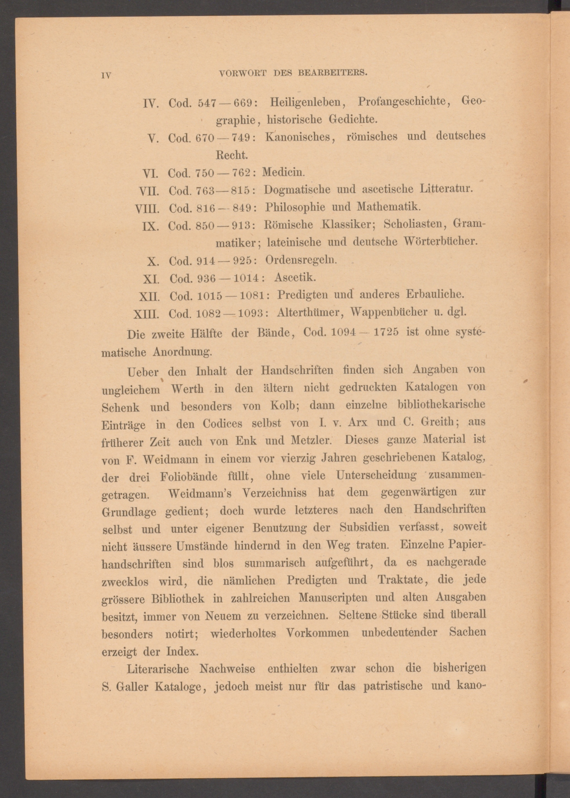 Ueber den Inhalt der Handschriften finden sich Angaben vonungleichem Werth in den altern nicht gedruckten Katalogen vonSchenk und besonders von Kolb; dann einzelne bibliothekarischeEinträge in den Codices selbst von I. v. Arx und C. Greith; ausfrüherer Zeit auch von Enk und Metzler. Dieses ganze Material istvon F. Weidmann in einem vor vierzig Jahren geschriebenen Katalog,der drei Foliobände füllt, ohne viele Unterscheidung zusammen-getragen. Weidmann’s Verzeichniss hat dem gegenwärtigen zurGrundlage gedient; doch wurde letzteres nach den Handschriftenselbst und unter eigener Benutzung der Subsidien verfasst, soweitnicht äussere Umstände hindernd in den Weg traten. Einzelne Papier-handschriften sind blos summarisch aufgeführt, da es nachgeradezwecklos wird, die nämlichen Predigten und Traktate, die jedegrössere Bibliothek in zahlreichen Manuscripten und alten Ausgabenbesitzt, immer von Neuem zu verzeichnen. Seltene Stücke sind überallbesonders notirt; wiederholtes Vorkommen unbedeutender Sachenerzeigt der Index.