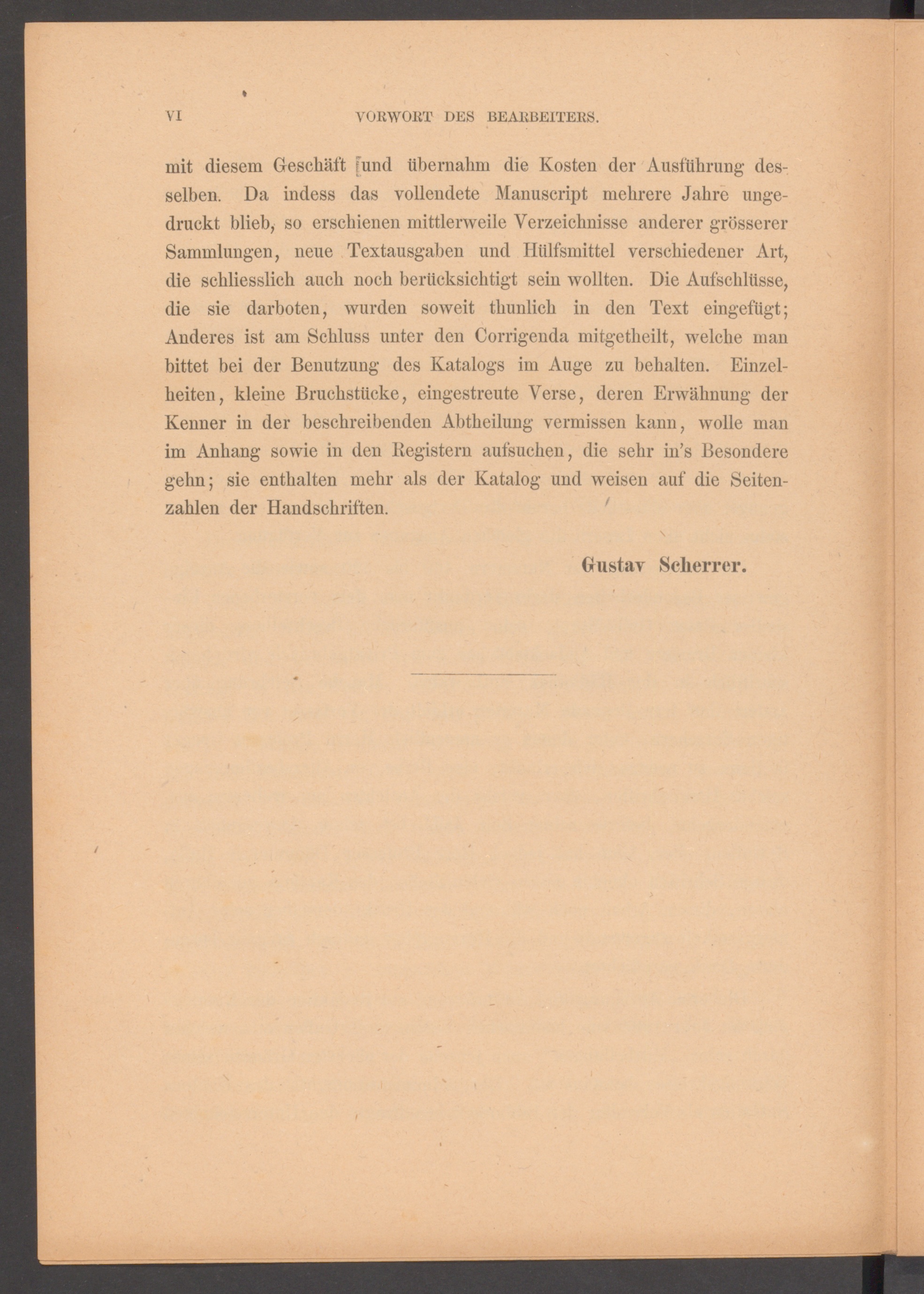 mit diesem Geschäft [und übernahm die Kosten der Ausführung des-selben. Da indess das vollendete Manuscript mehrere Jahre unge-druckt blieb, so erschienen mittlerweile Verzeichnisse anderer grössererSammlungen, neue Textausgaben und Hülfsmittel verschiedener Art,die schliesslich auch noch berücksichtigt sein wollten. Die Aufschlüsse,die sie darboten, wurden soweit thunlich in den Text eingefügt;Anderes ist am Schluss unter den Corrigenda mitgetlieilt, welche manbittet bei der Benutzung des Katalogs im Auge zu behalten. Einzel-heiten, kleine Bruchstücke, eingestreute Verse, deren Erwähnung derKenner in der beschreibenden Abtheilung vermissen kann, wolle manim Anhang sowie in den Registern aufsuchen, die sehr in’s Besonderegehn; sie enthalten mehr als der Katalog und weisen auf die Seiten-zahlen der Handschriften. '