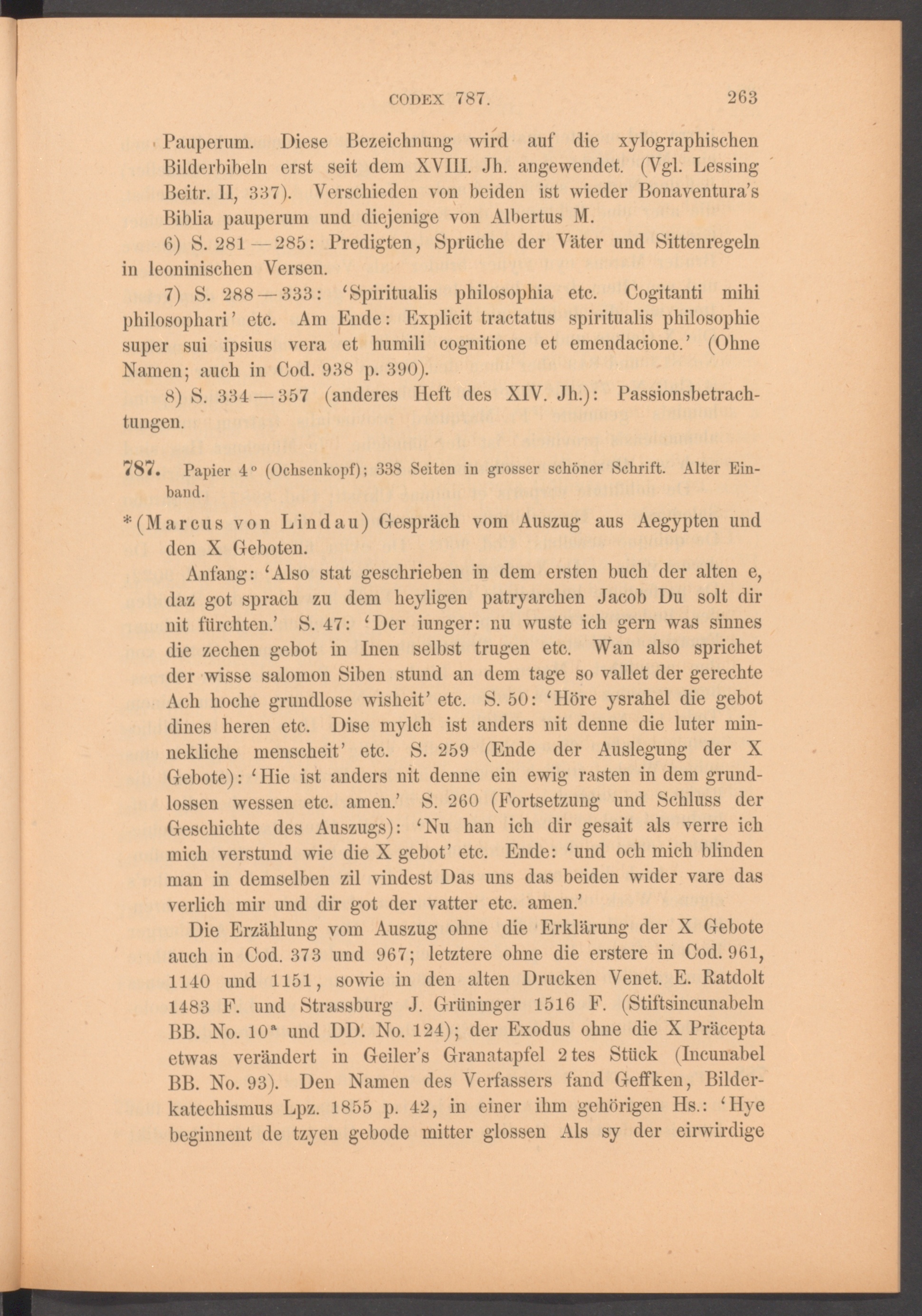 Die Erzählung vom Auszug ohne die Erklärung der X Geboteauch in Cod. 373 und 967; letztere ohne die erstere in Cod. 961,1140 und 1151, sowie in den alten Drucken Venet. E. Ratdolt1483 F. und Strassburg J. Grüninger 1516 F. (StiftsincunabelnBB. No. 10 a und DD. No. 124); der Exodus ohne die X Präceptaetwas verändert in Geiler’s Granatapfel 2tes Stück (IncunabelBB. No. 93). Den Namen des Verfassers fand Geffken, Bilder-katechismus Lpz. 1855 p. 42, in einer ihm gehörigen Hs.: ‘Hyebeginnent de tzyen gebode mitter glossen Als sy der eirwirdige