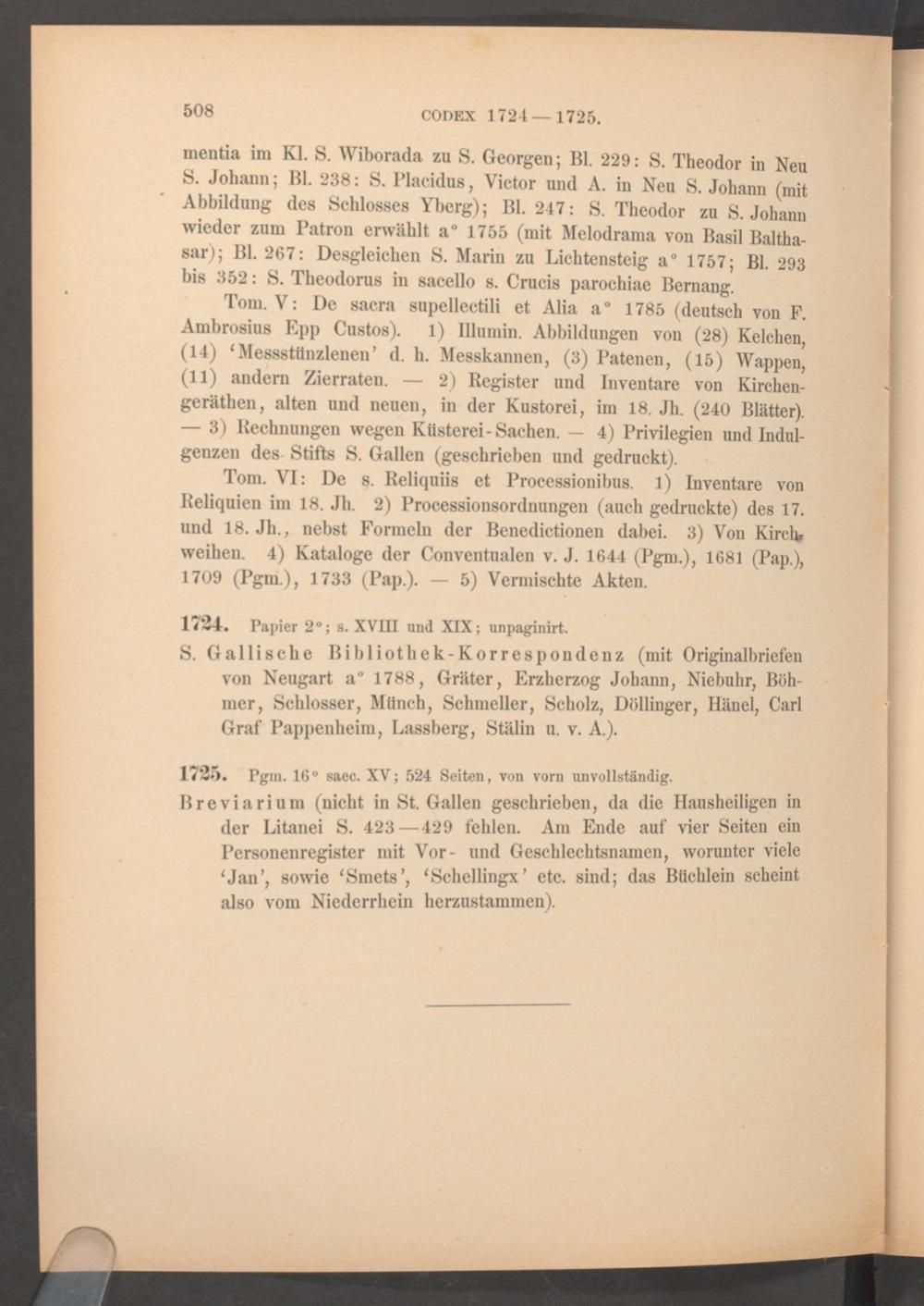 S. Gallische Bibliothek-Korrespondenz (mit Originalbriefenvon Neugart a° 1788, Gräter, Erzherzog Johann, Niebuhr, Böh-mer, Schlosser, Münch, Schmeller, Scholz, Döllinger, Hänel, CarlGraf Pappenheim, Lassberg, Stälin u. v. A.).