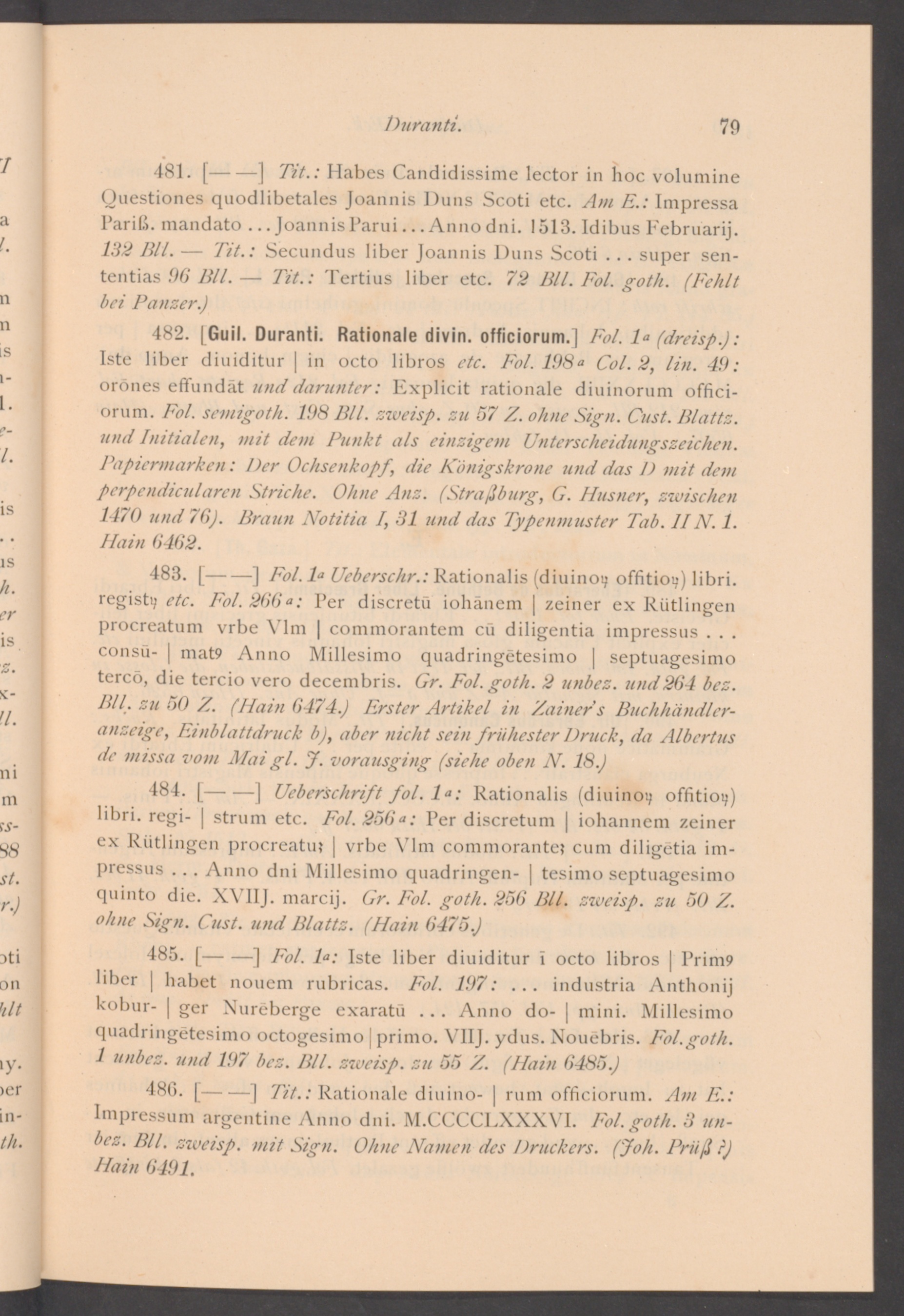 482. [Guil. Duranti. Rationale divin. officiorum.] Fol. 1“ (dreisp.):Iste liber diuiditur | in octo libros etc. Fol. 198“ Col.2, lin. 49:orönes effundät und darunter: Explicit rationale diuinorum offici-orum. Fol. semigoth. 198 Bll. zweisp. zu 57 Z. ohne Sign. Cust. Blattz.und Initialen , mit dem Punkt als einzigem Unterscheidungszeichen.Papiermarken: Der Ochsenkopf, die Königskrone und das D mit dempcrpendicularen Striche. Ohne Anz. (Straßburg, G. Husner, zwischen1470 und 76). Braun Notitia I, 31 und das Typenmuster Tab. IIN. 1.Hain 6462.